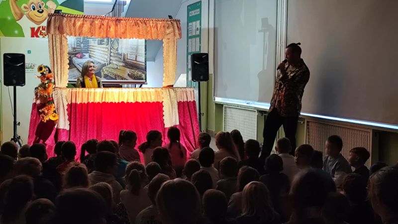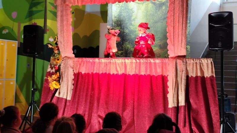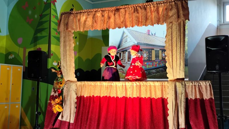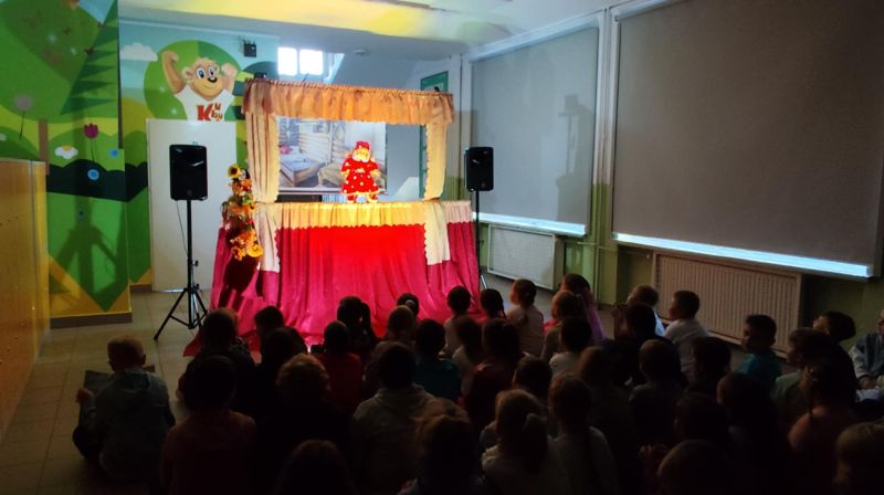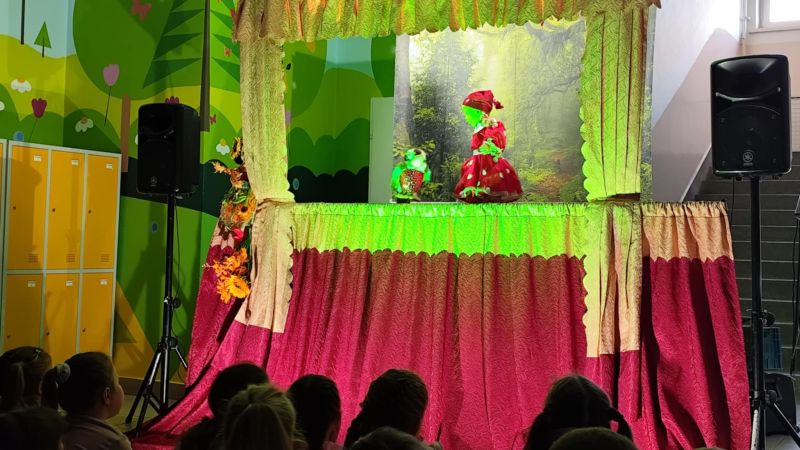 W dniu 6 października 2025 r. agencja artystyczna "Art Cinema" z Nowego Sącza zaprezentowała naszym uczniom edukacji wczesnoszkolnej teatrzyk lalkowy pt. ,,Jesienne porządki Czerwonego Kapturka". Babcia, straszny wilk i dziewczynka w czerwonym kapturku to główni bohaterowie prezentowanej opowieści. Dzieci z zaciekawieniem śledziły losy bohaterów, oglądały zmieniającą się scenografię i słuchały towarzyszącej scenom muzyki. Głównym przesłaniem tej bajki było to, aby nie rozmawiać z obcymi osobami. Było także nawiązanie do obecnej pory roku czyli jesieni. Na zakończenie dzieci nagrodziły artystów gromkimi brawami.