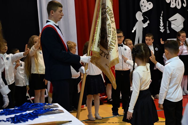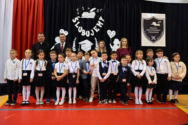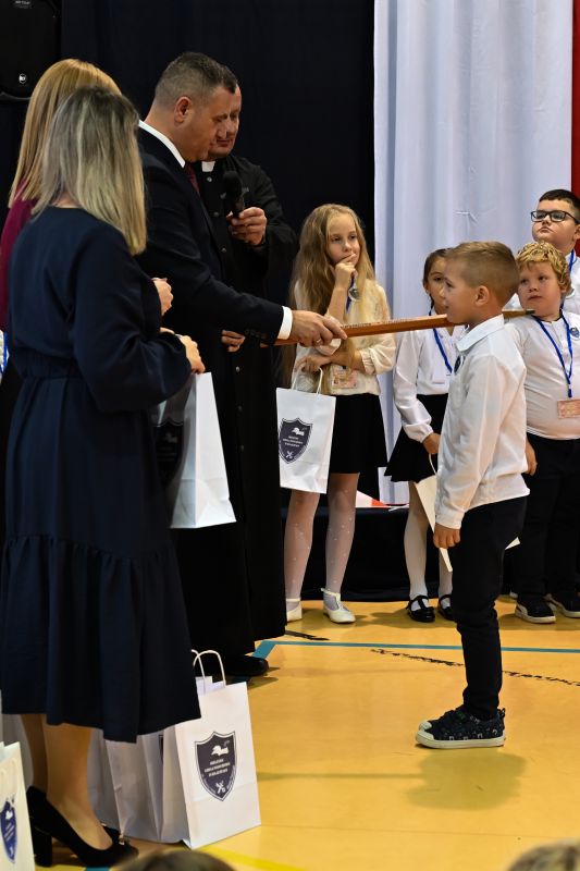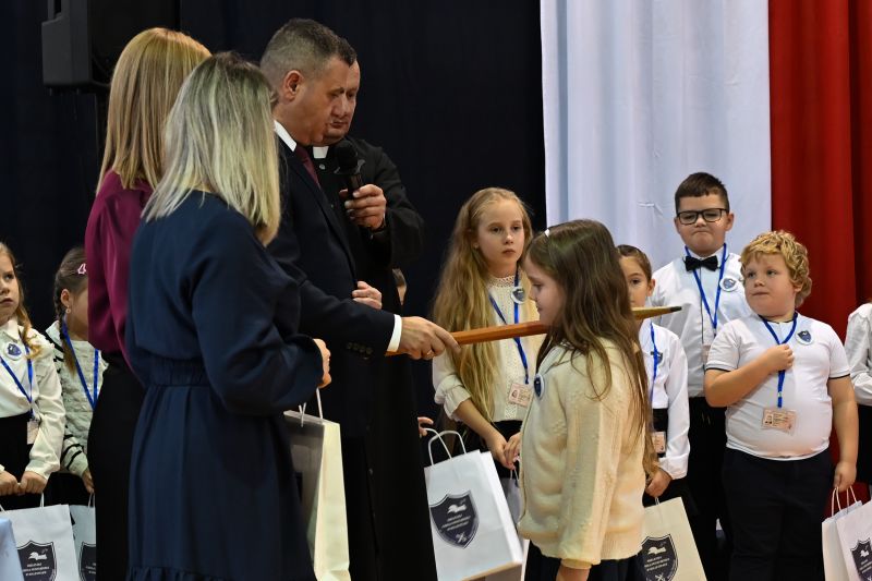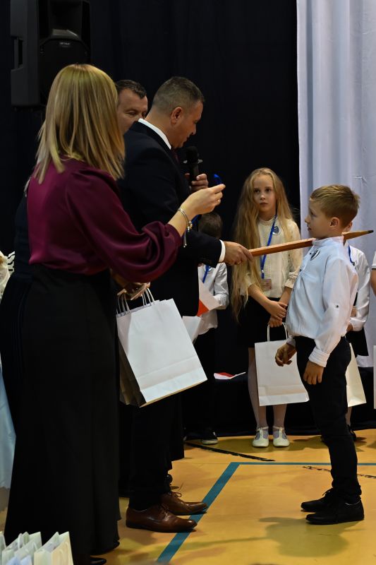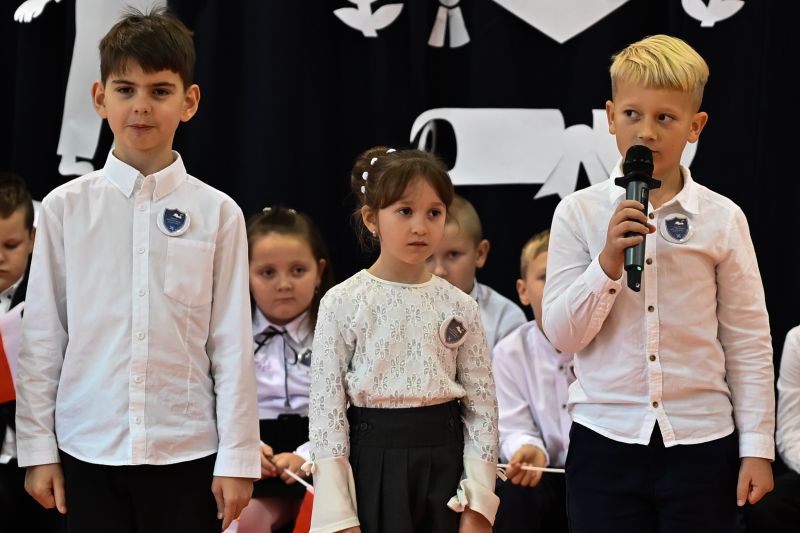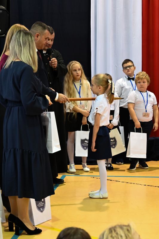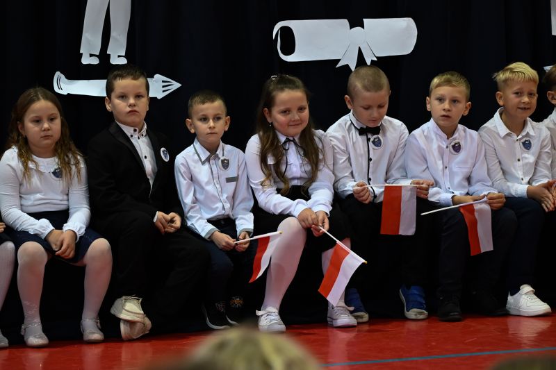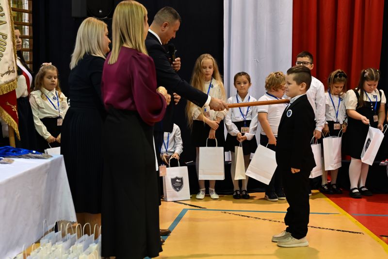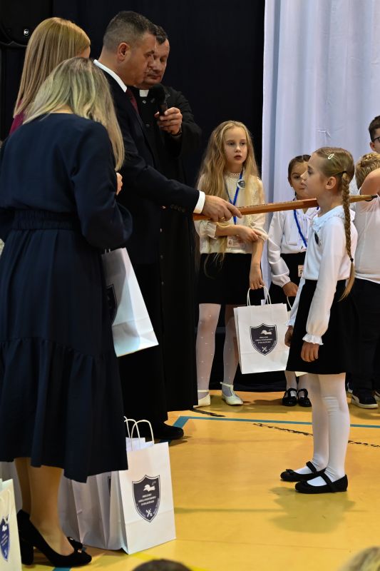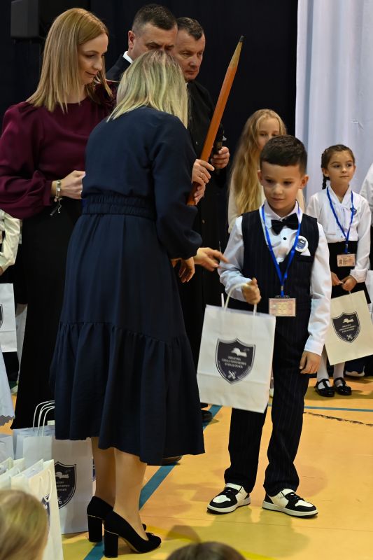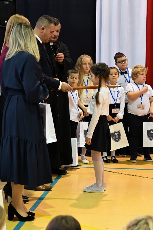 Po zakończeniu części artystycznej, w niezwykle podniosłej atmosferze, przed pocztem sztandarowym uczniowie ślubowali być dobrymi Polakami, godnie reprezentować swoją szkołę i klasę oraz rzetelnie wypełniać szkolne obowiązki. Po ślubowaniu aktu pasowania na ucznia dokonał zabytkowym ołówkiem pan dyrektor mgr Adam Iwanicki, a uczniowie otrzymali z rąk pani wicedyrektor mgr Alicji Namysł legitymacje szkolne, upominki i dyplomy. Następnie ksiądz proboszcz Grzegorz Siciak poświęcił tornistry, pobłogosławił dzieci oraz podarował im pamiątkowe obrazki. Od tego momentu pierwszoklasiści zostali oficjalnie przyjęci w poczet uczniów naszej szkoły. Po ceremonii wykonano pamiątkowe fotografie. Na zakończenie uroczystości dzieci zostały zaproszone na poczęstunek ufundowany przez rodziców, którzy także wręczyli wszystkim dzieciom kredki pełne słodkości. Ten dzień na długo pozostanie w pamięci uczniów, nauczycieli i rodziców.