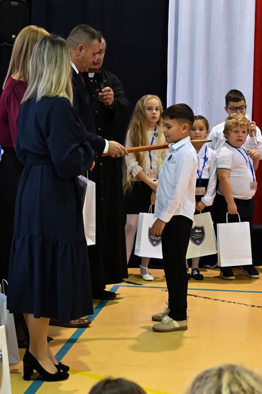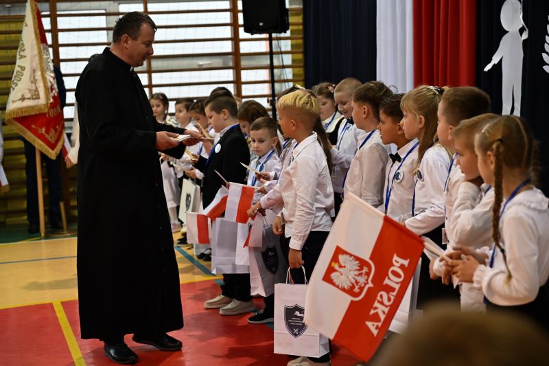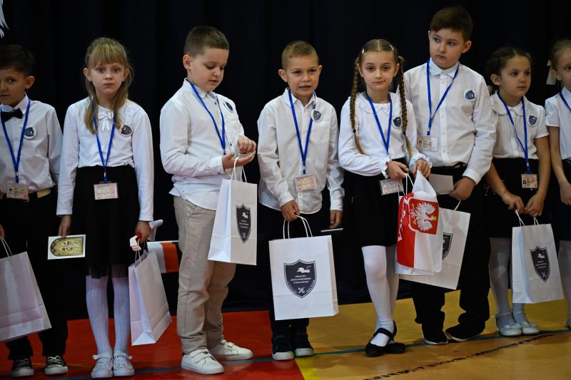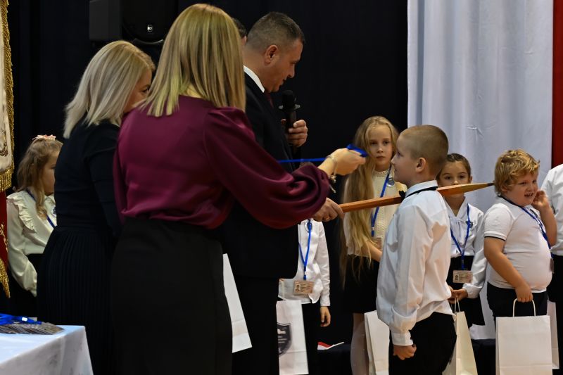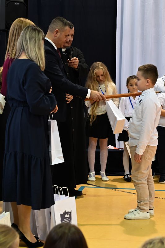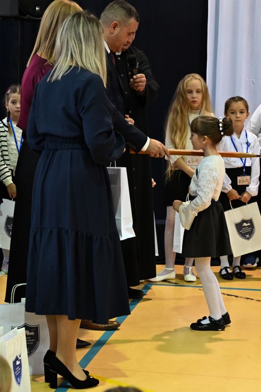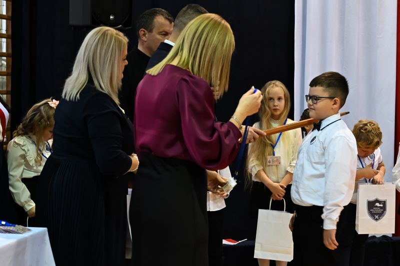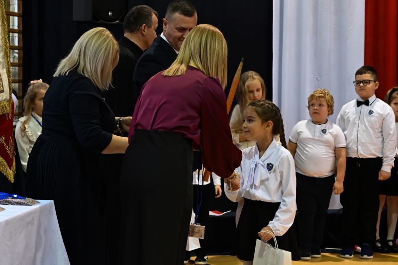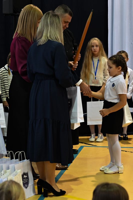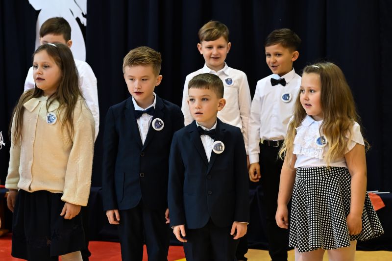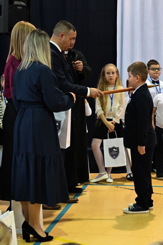 Po zakończeniu części artystycznej, w niezwykle podniosłej atmosferze, przed pocztem sztandarowym uczniowie ślubowali być dobrymi Polakami, godnie reprezentować swoją szkołę i klasę oraz rzetelnie wypełniać szkolne obowiązki. Po ślubowaniu aktu pasowania na ucznia dokonał zabytkowym ołówkiem pan dyrektor mgr Adam Iwanicki, a uczniowie otrzymali z rąk pani wicedyrektor mgr Alicji Namysł legitymacje szkolne, upominki i dyplomy. Następnie ksiądz proboszcz Grzegorz Siciak poświęcił tornistry, pobłogosławił dzieci oraz podarował im pamiątkowe obrazki. Od tego momentu pierwszoklasiści zostali oficjalnie przyjęci w poczet uczniów naszej szkoły. Po ceremonii wykonano pamiątkowe fotografie. Na zakończenie uroczystości dzieci zostały zaproszone na poczęstunek ufundowany przez rodziców, którzy także wręczyli wszystkim dzieciom kredki pełne słodkości. Ten dzień na długo pozostanie w pamięci uczniów, nauczycieli i rodziców.