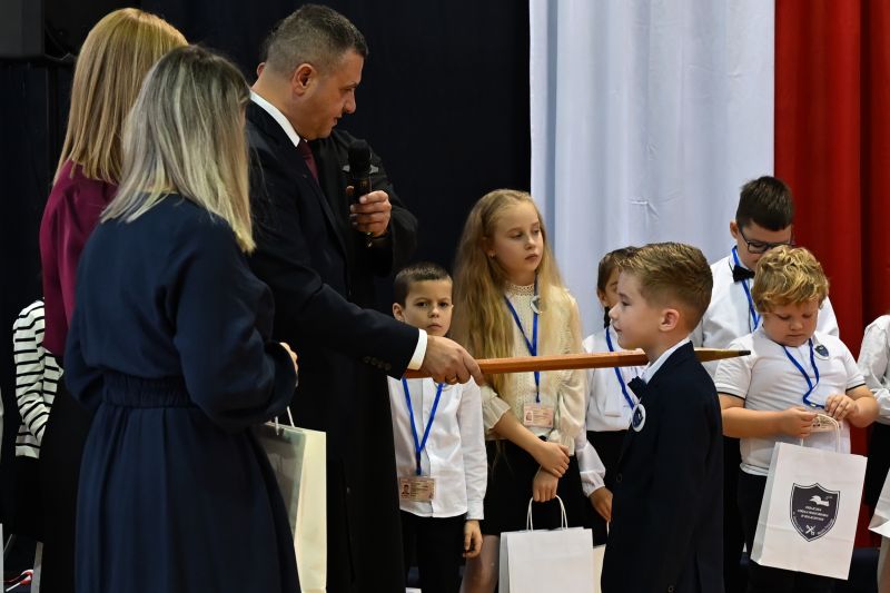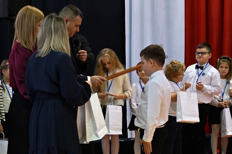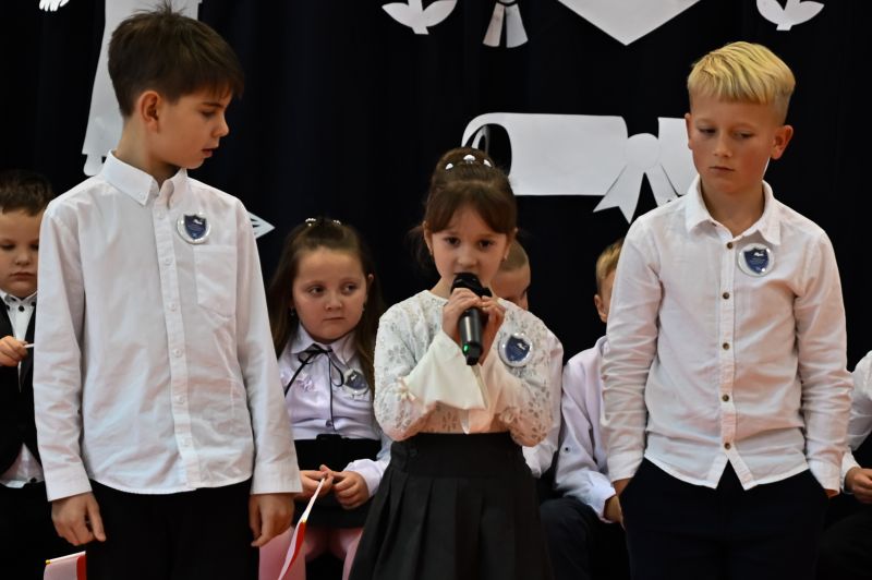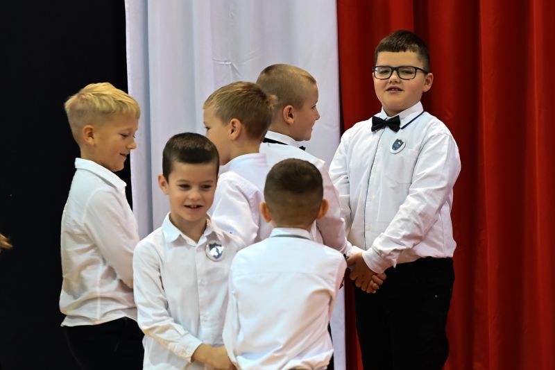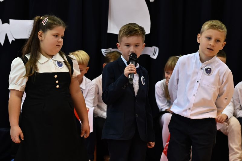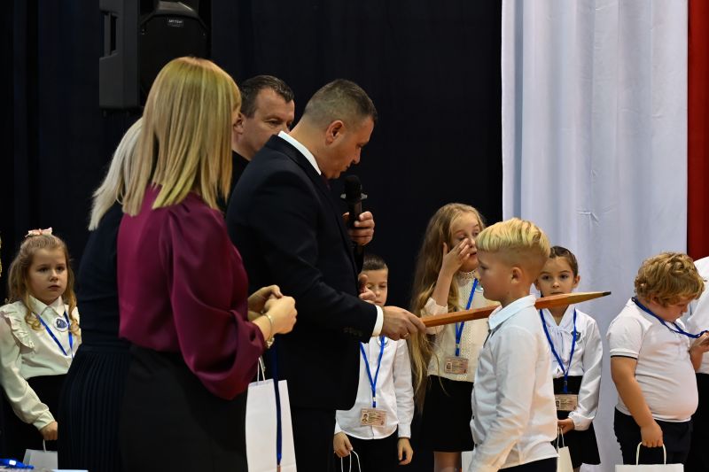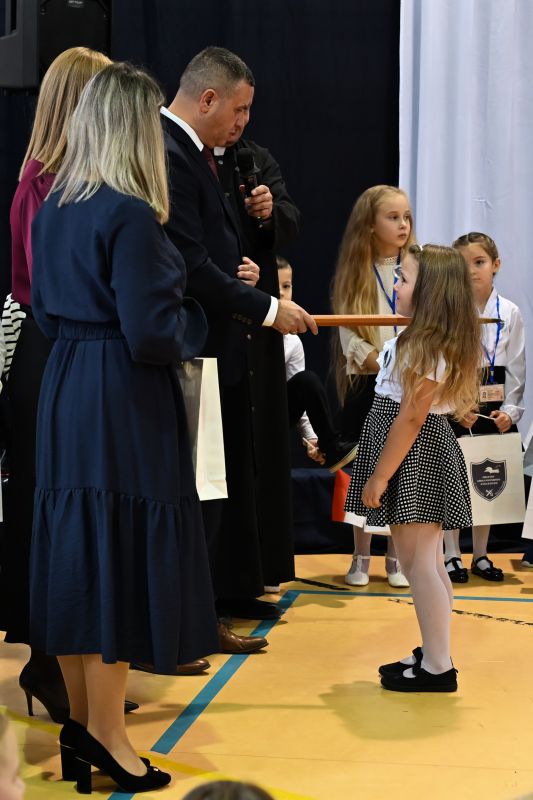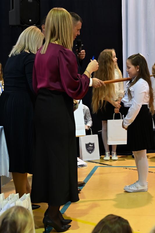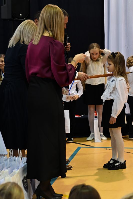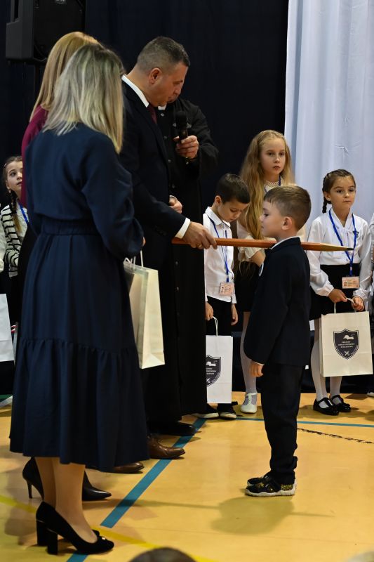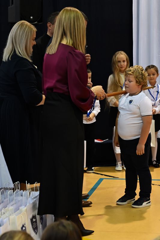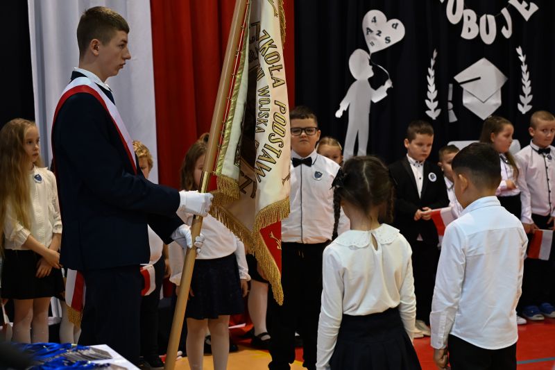 Po zakończeniu części artystycznej, w niezwykle podniosłej atmosferze, przed pocztem sztandarowym uczniowie ślubowali być dobrymi Polakami, godnie reprezentować swoją szkołę i klasę oraz rzetelnie wypełniać szkolne obowiązki. Po ślubowaniu aktu pasowania na ucznia dokonał zabytkowym ołówkiem pan dyrektor mgr Adam Iwanicki, a uczniowie otrzymali z rąk pani wicedyrektor mgr Alicji Namysł legitymacje szkolne, upominki i dyplomy. Następnie ksiądz proboszcz Grzegorz Siciak poświęcił tornistry, pobłogosławił dzieci oraz podarował im pamiątkowe obrazki. Od tego momentu pierwszoklasiści zostali oficjalnie przyjęci w poczet uczniów naszej szkoły. Po ceremonii wykonano pamiątkowe fotografie. Na zakończenie uroczystości dzieci zostały zaproszone na poczęstunek ufundowany przez rodziców, którzy także wręczyli wszystkim dzieciom kredki pełne słodkości. Ten dzień na długo pozostanie w pamięci uczniów, nauczycieli i rodziców.