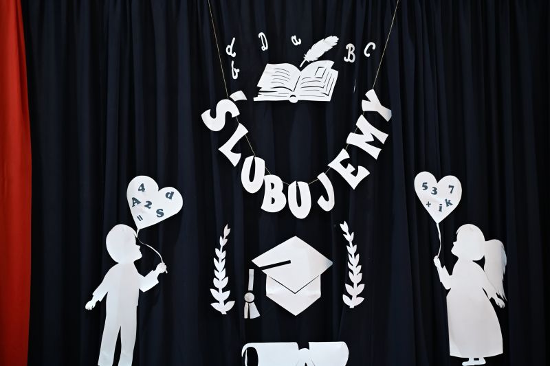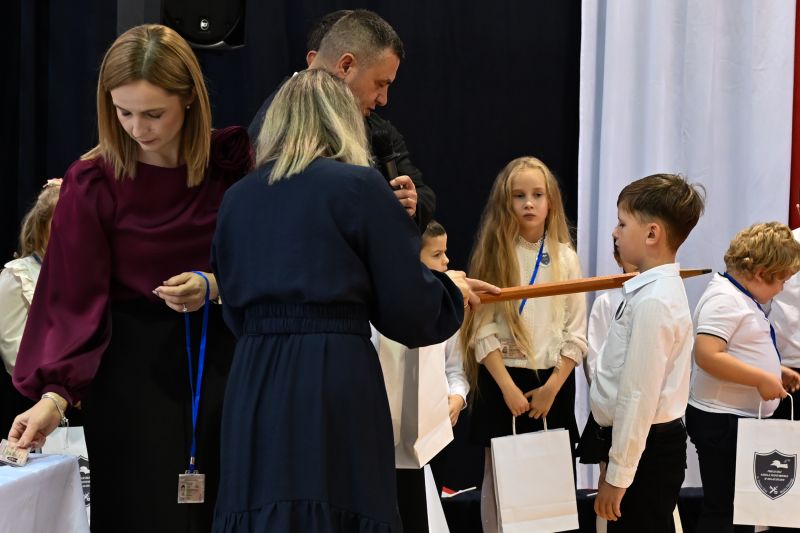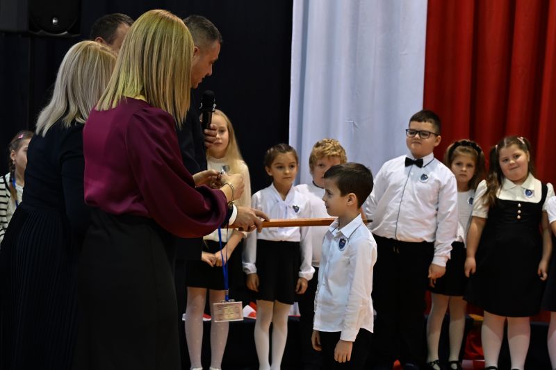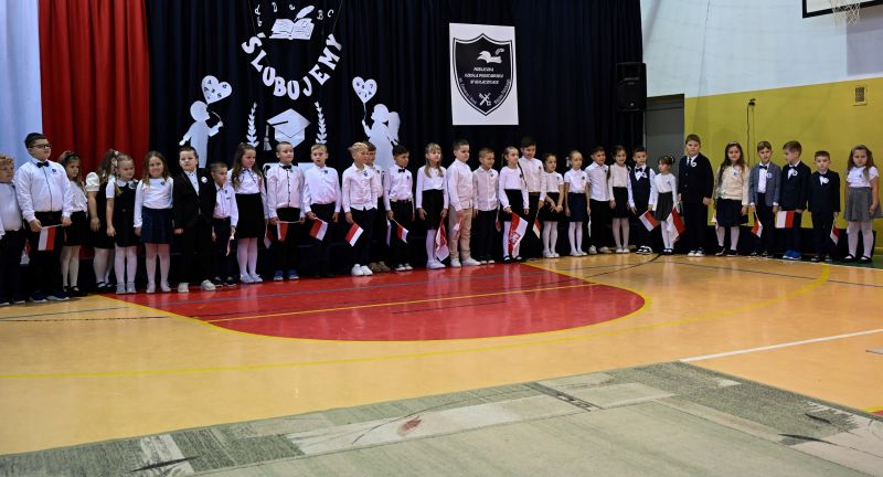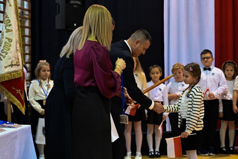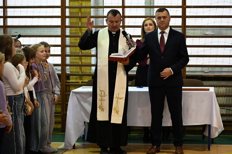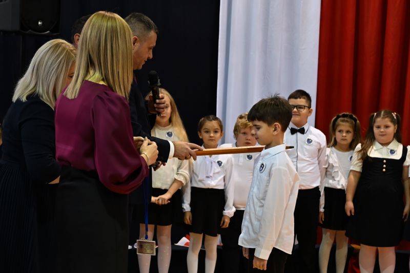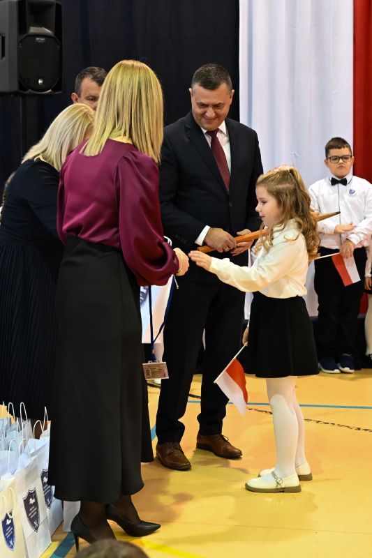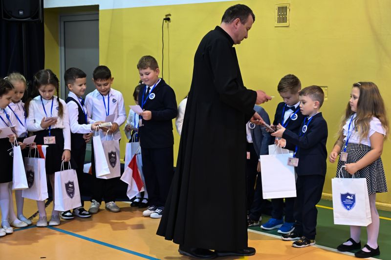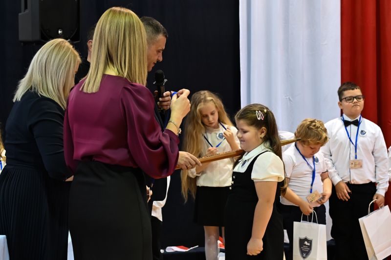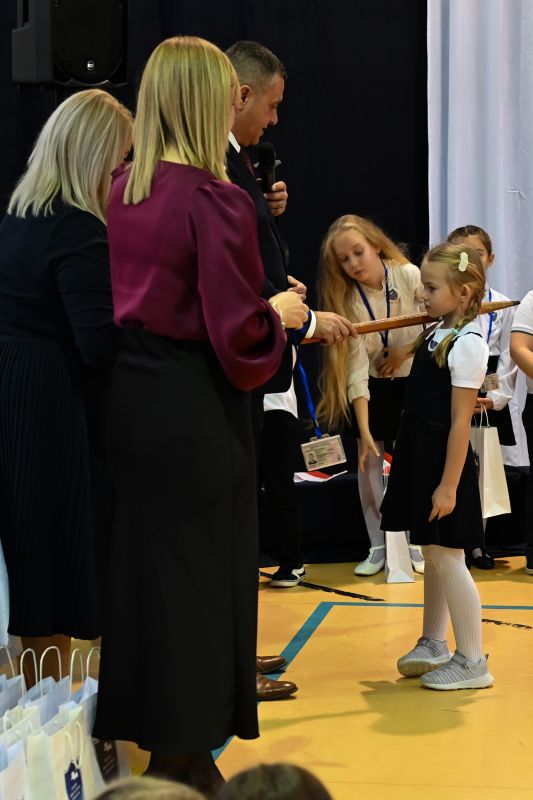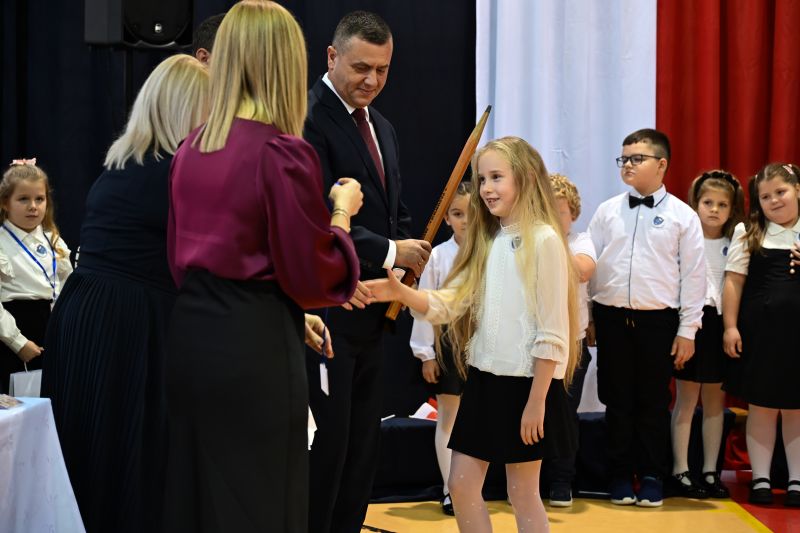 Po zakończeniu części artystycznej, w niezwykle podniosłej atmosferze, przed pocztem sztandarowym uczniowie ślubowali być dobrymi Polakami, godnie reprezentować swoją szkołę i klasę oraz rzetelnie wypełniać szkolne obowiązki. Po ślubowaniu aktu pasowania na ucznia dokonał zabytkowym ołówkiem pan dyrektor mgr Adam Iwanicki, a uczniowie otrzymali z rąk pani wicedyrektor mgr Alicji Namysł legitymacje szkolne, upominki i dyplomy. Następnie ksiądz proboszcz Grzegorz Siciak poświęcił tornistry, pobłogosławił dzieci oraz podarował im pamiątkowe obrazki. Od tego momentu pierwszoklasiści zostali oficjalnie przyjęci w poczet uczniów naszej szkoły. Po ceremonii wykonano pamiątkowe fotografie. Na zakończenie uroczystości dzieci zostały zaproszone na poczęstunek ufundowany przez rodziców, którzy także wręczyli wszystkim dzieciom kredki pełne słodkości. Ten dzień na długo pozostanie w pamięci uczniów, nauczycieli i rodziców.