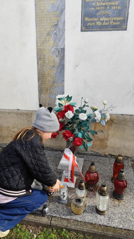 Uczniowie naszej szkoły wzięli udział w  akcji „Szkoła Pamięta”, której celem jest zwrócenie uwagi młodych ludzi na potrzebę pielęgnowania pamięci o bohaterach naszej wolności, szczególnie tych, którzy są związani z historią danego miejsca, regionu, społeczności. W ramach tej inicjatywy uczniowie udali się na cmentarz parafialny i pod Obelisk Katyński, aby zapalić znicz i oddać hołd poległym w obronie Ojczyzny mieszkańcom Kołaczyc.