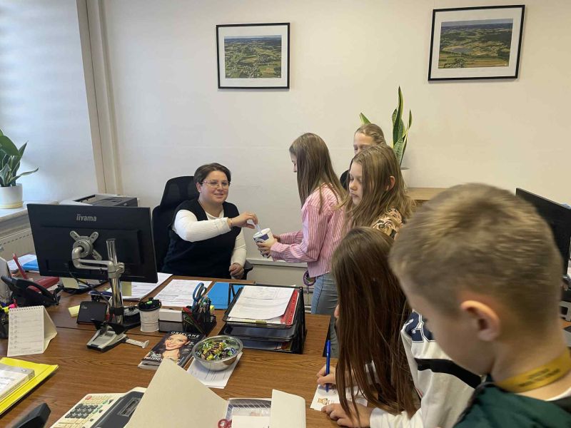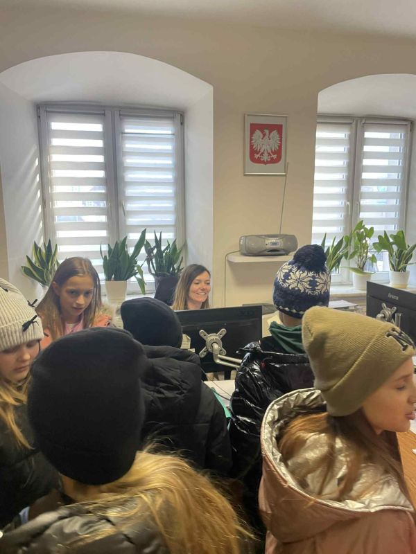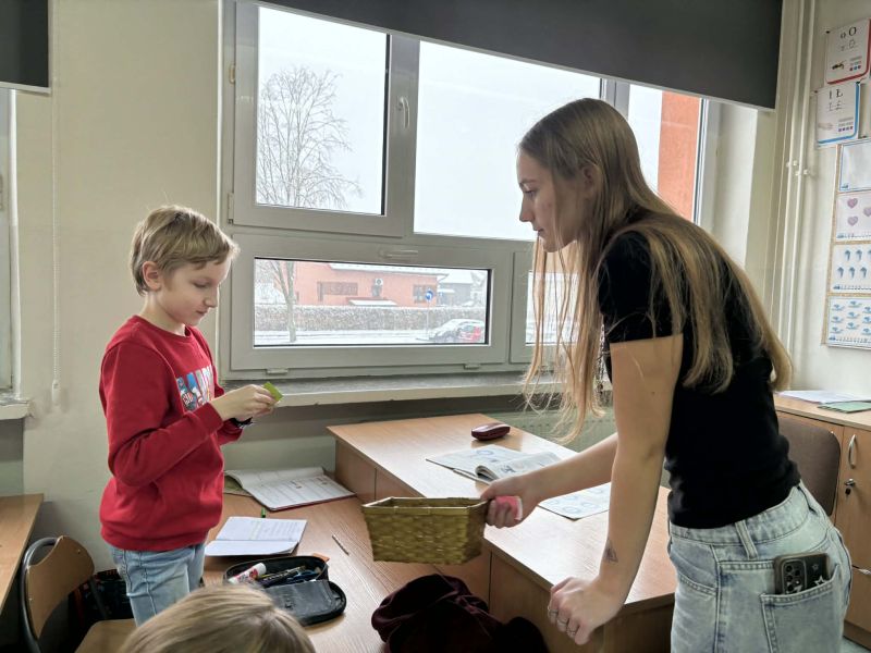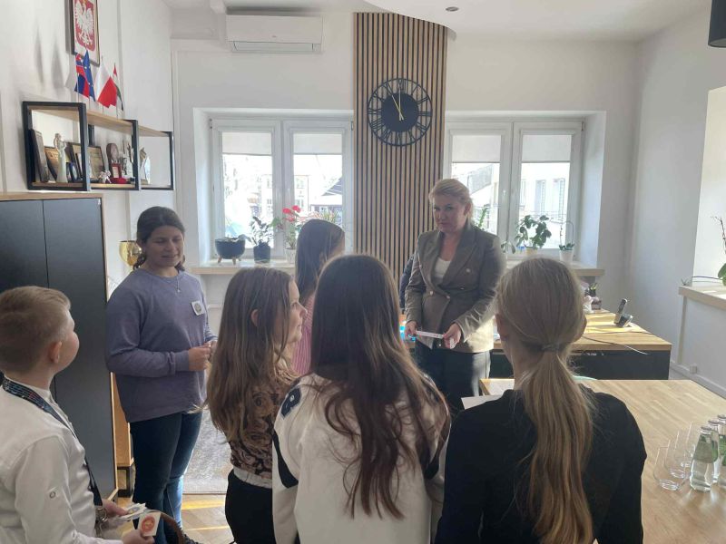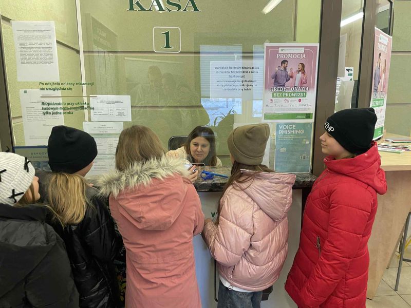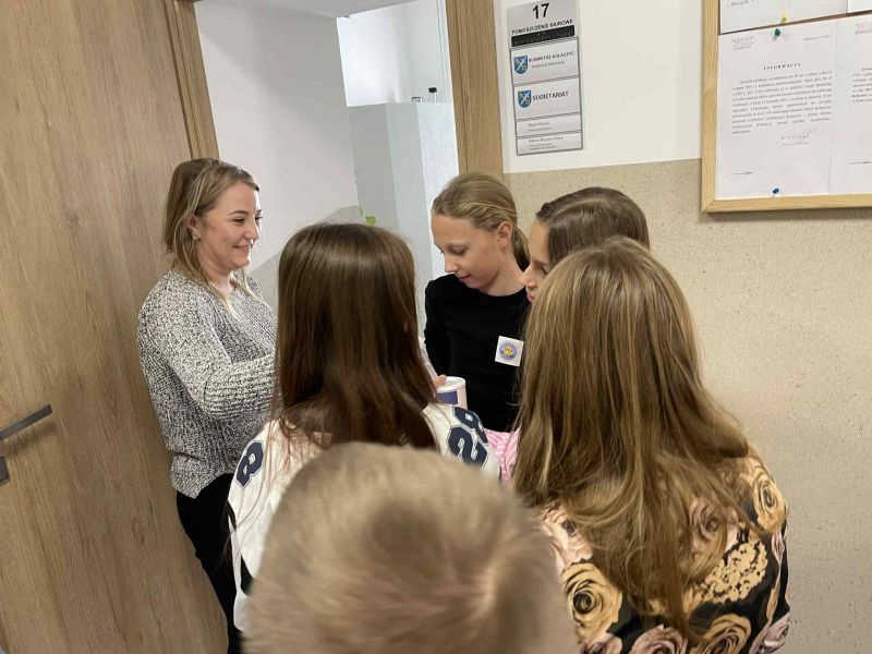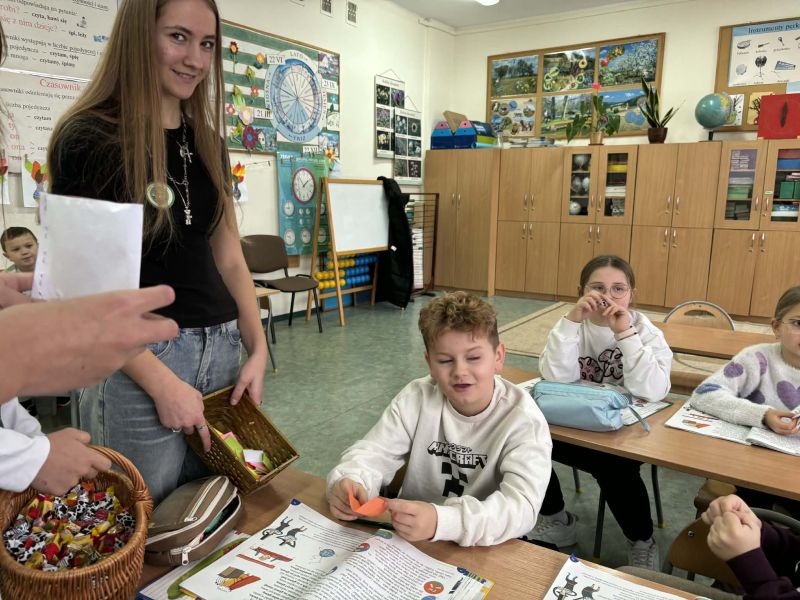 Ze względu na niesprzyjającą pogodę część terenowa wydarzenia odbyła się 24 listopada. Tego dnia uczniowie klasy 5a wyruszyli do mieszkańców Kołaczyc, odwiedzając m.in. panią Burmistrz Magdalenę Stasiowską, pracowników Urzędu Gminy, Banku Spółdzielczego, okoliczne sklepy oraz przechodniów. Spotkania przebiegały w bardzo serdecznej atmosferze — uczniowie z zaangażowaniem zadawali pytania, a mieszkańcy odpowiadali z widoczną radością. Wszyscy bezbłędnie poradzili sobie z wylosowanymi działaniami i otrzymali certyfikat oraz pamiątkową zakładkę z tabliczką mnożenia.