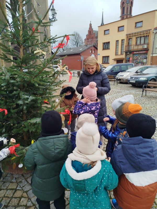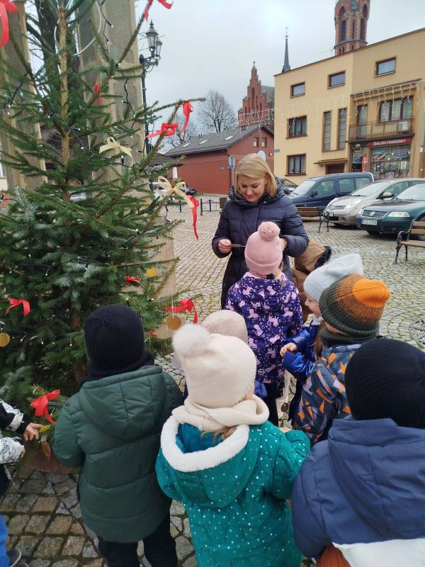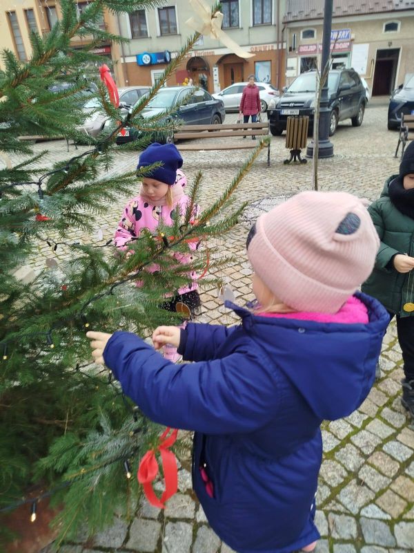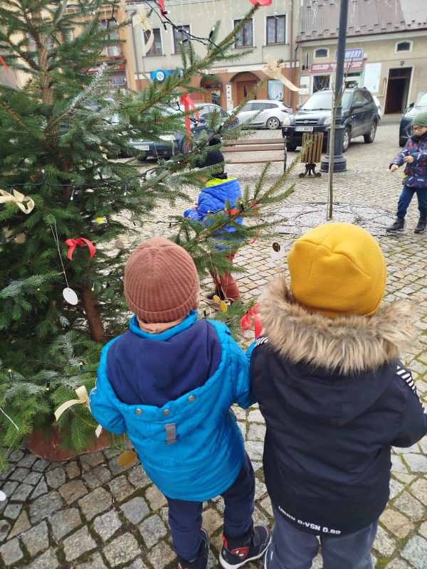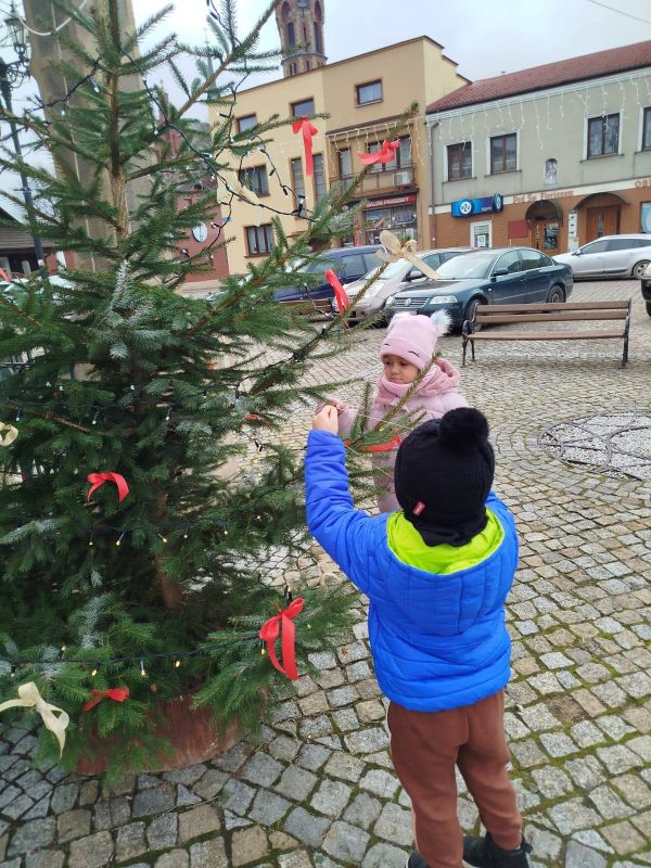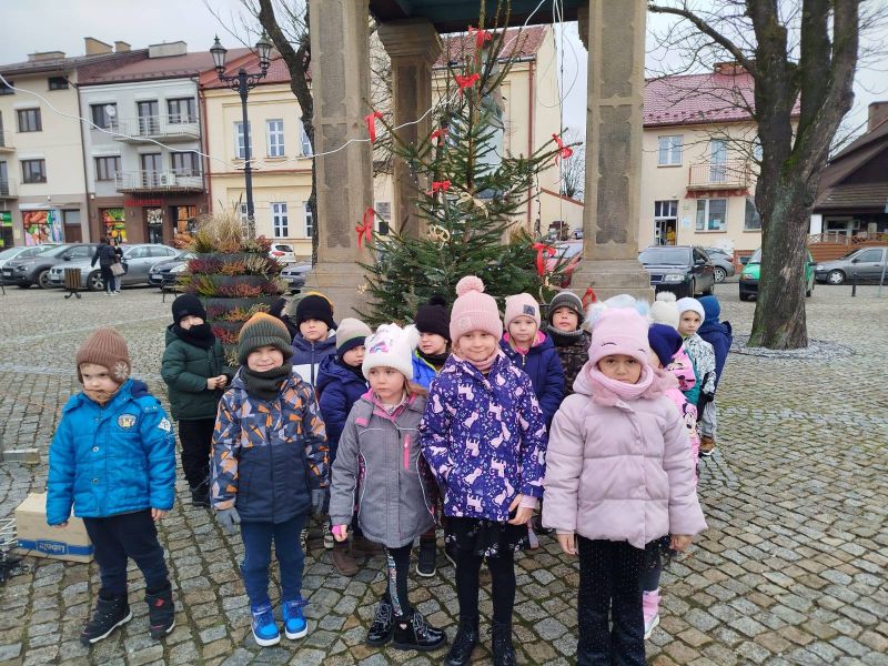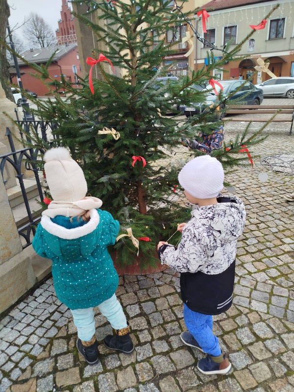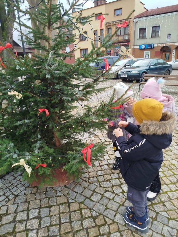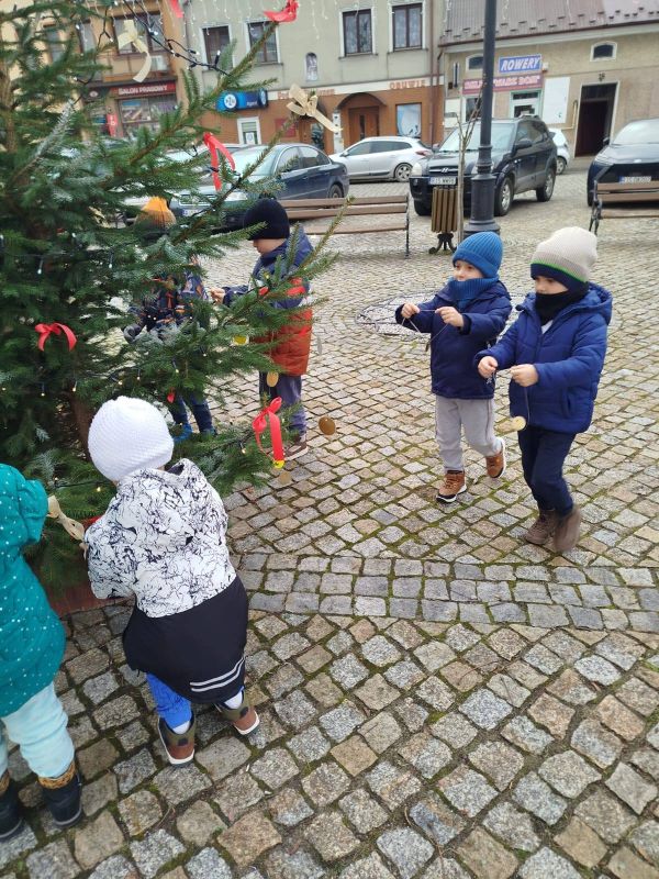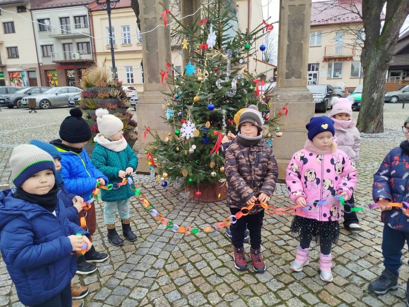 Nasze przedszkole zostało poproszone o udekorowanie choinki na rynku w Kołaczycach. Wszystkie dzieci wykonały piękne ozdoby - łańcuchy, gwiazdeczki, bombeczki. To świąteczne zadanie wykonała grupa Pszczółki jako reprezentacja naszego przedszkola.