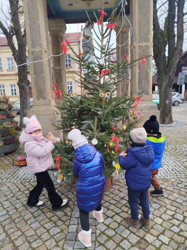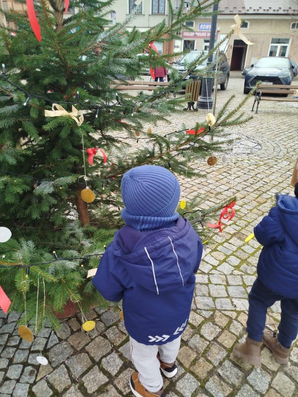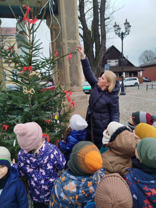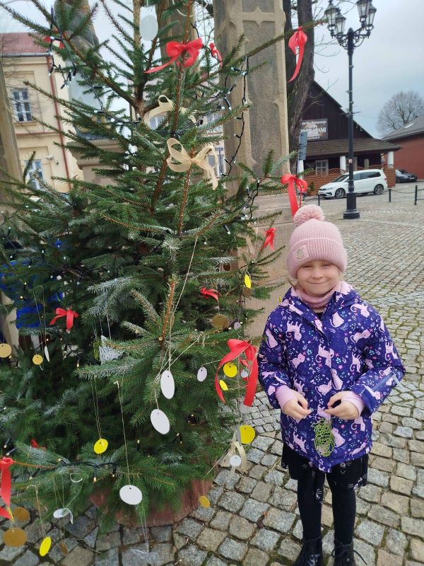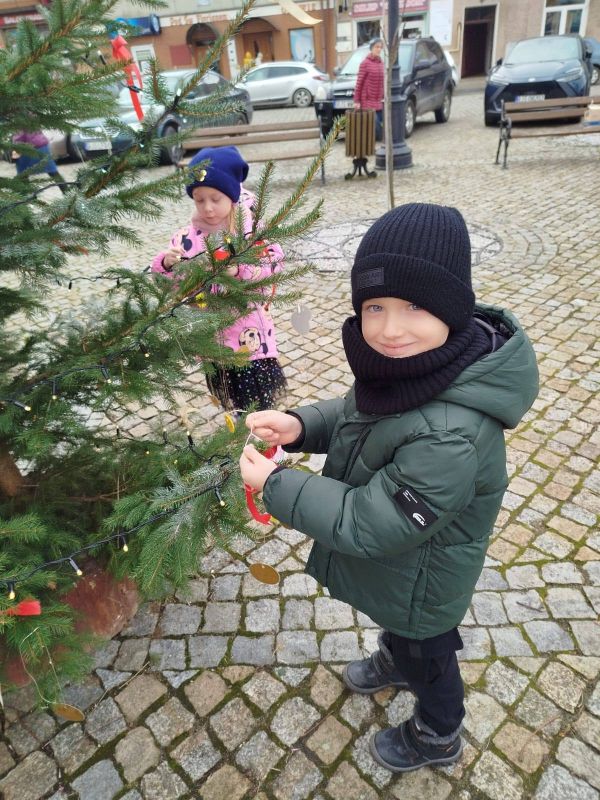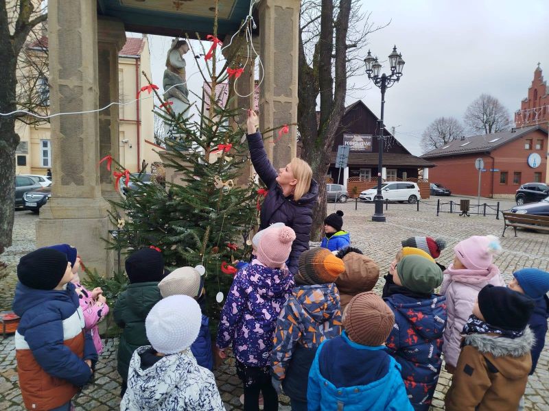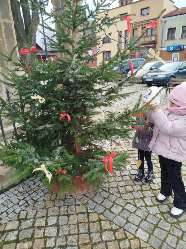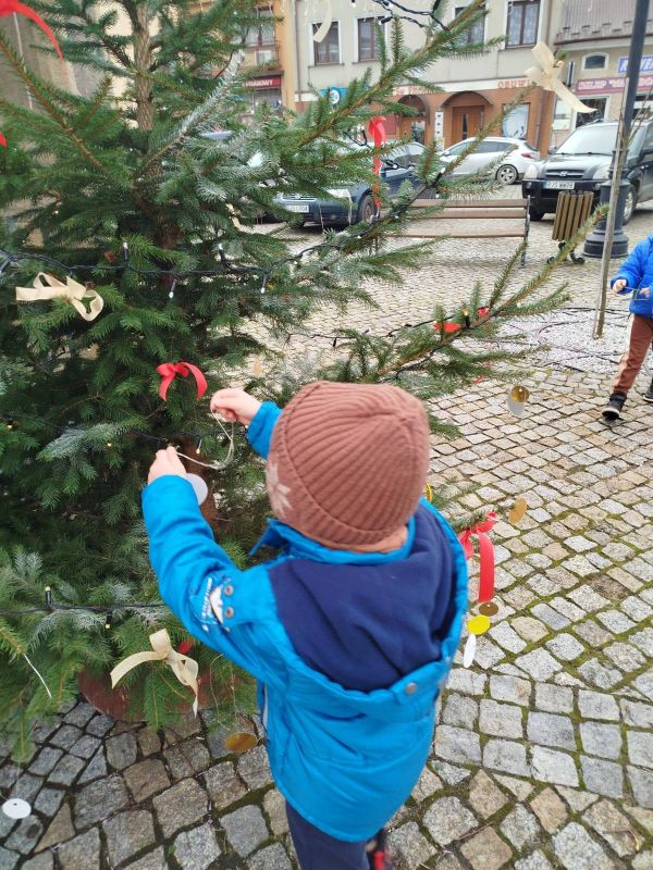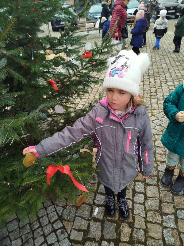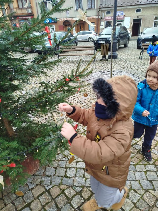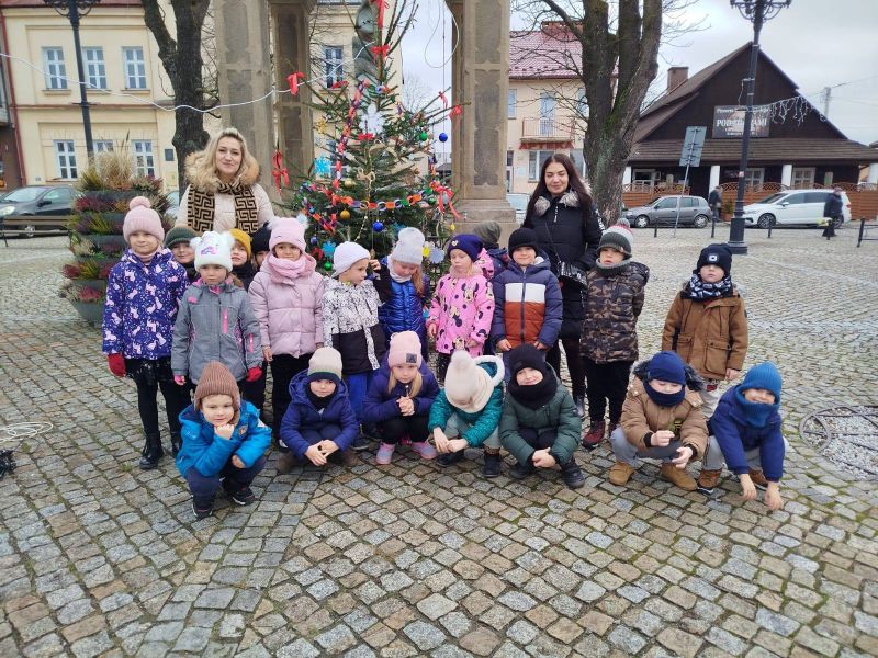 Nasze przedszkole zostało poproszone o udekorowanie choinki na rynku w Kołaczycach. Wszystkie dzieci wykonały piękne ozdoby - łańcuchy, gwiazdeczki, bombeczki. To świąteczne zadanie wykonała grupa Pszczółki jako reprezentacja naszego przedszkola.