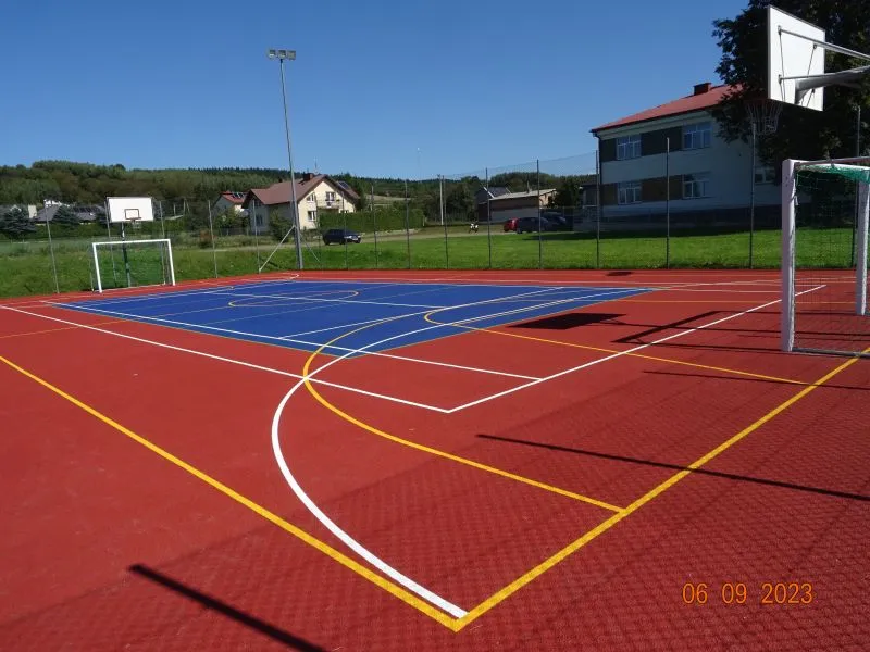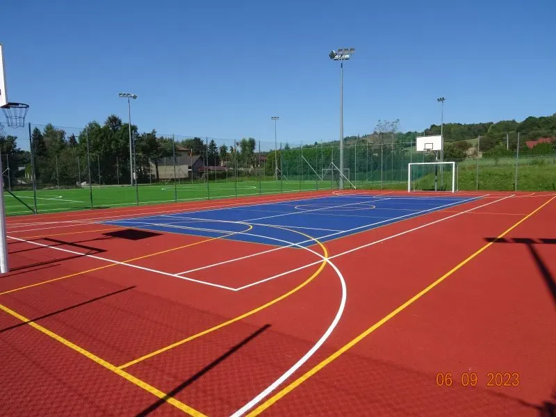 - wykonanie retopingu nawierzchni poliuretanowej (czyszczenie, impregnacja podłoża, wykonanie dwukrotnego natrysku, malowanie linii: boisko do siatkówki, koszykówki, tenisa i piłki ręcznej) - 613,11 m2