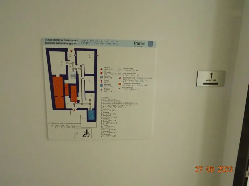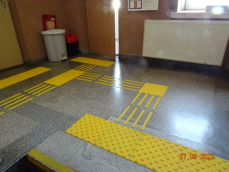 3) Oznakowanie pomieszczeń i ciągów komunikacyjnych alfabetem Braillea (49 tabliczek),
