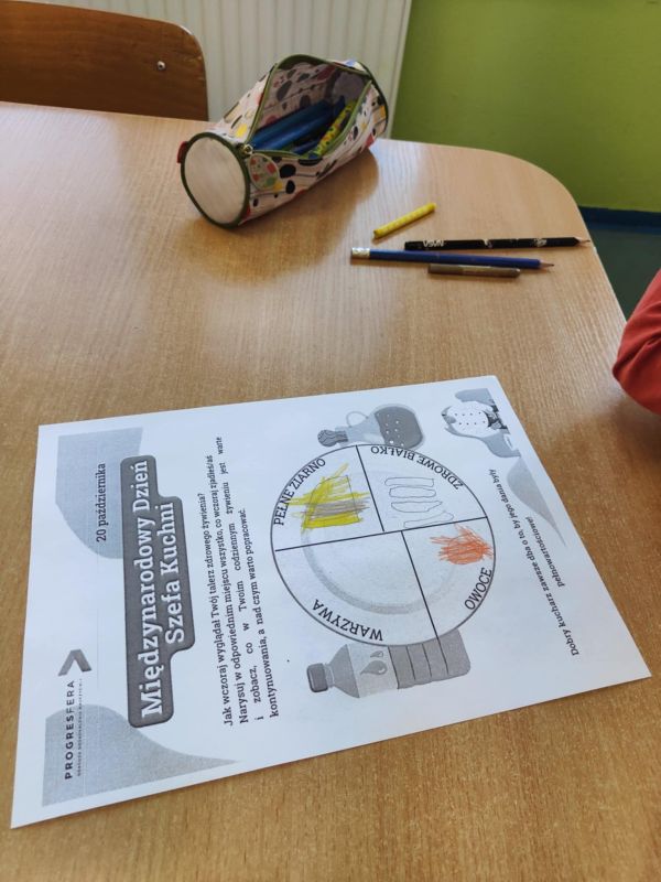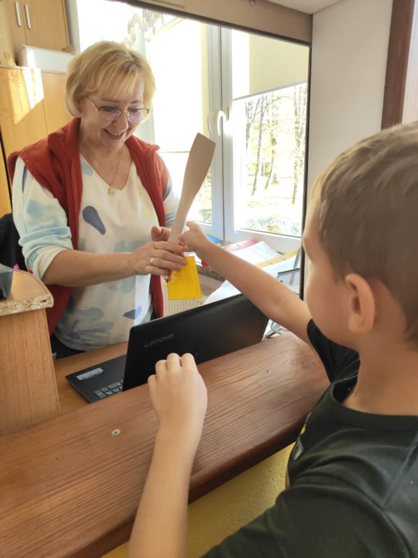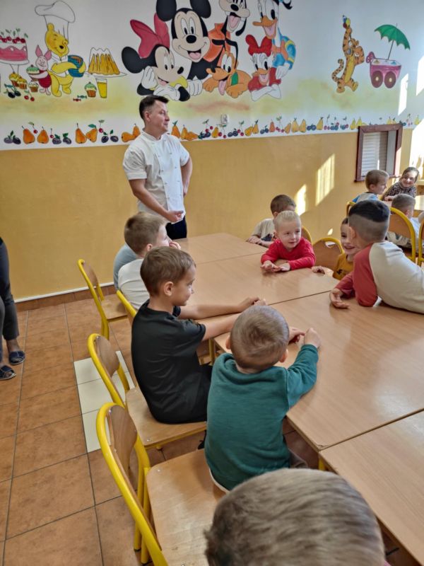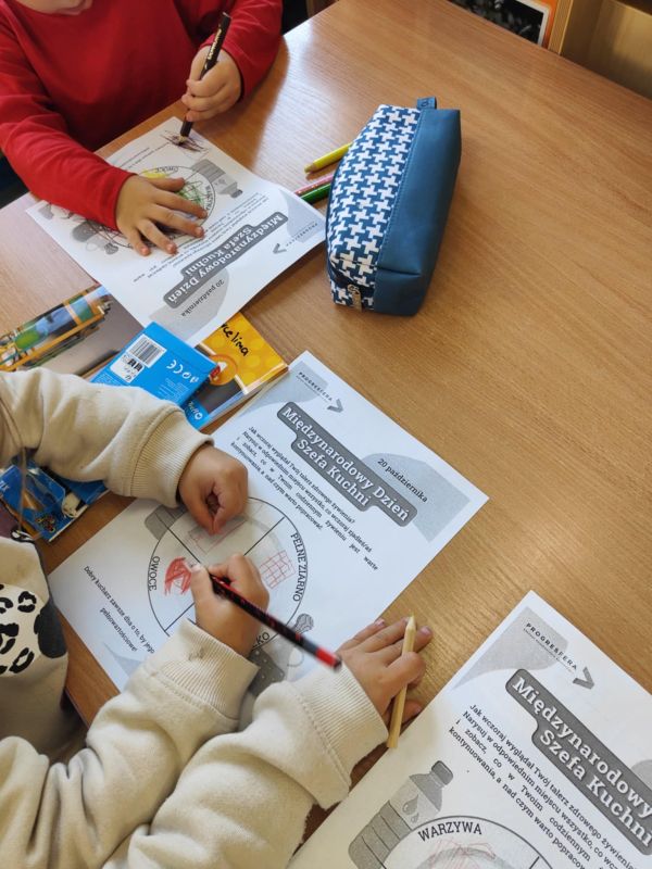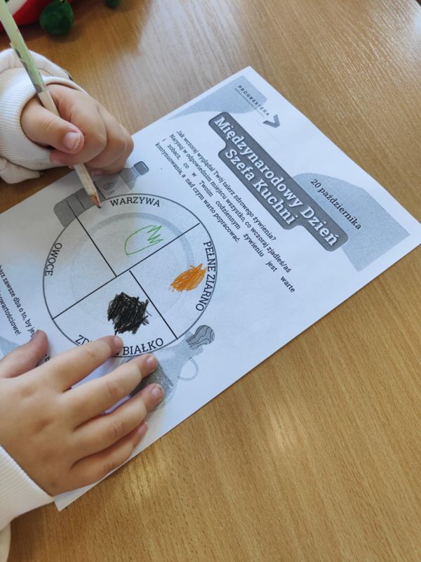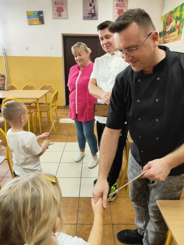 Na zakończenie wizyty przedszkolaki z wychowawcami wręczyły panu kucharzowi i wszystkim pracownikom kuchni własnoręcznie zrobiony pamiątkowy upominek i podziękowania za codzienny trud i uśmiech. Po spotkaniu dzieci wzięły udział w zajęciach plastycznych, podczas których wykonały kolorowe prace związane ze zdrowym jedzeniem. Na kartkach pojawiły się owoce, warzywa i zdrowe potrawy - wszystko to, co pomaga nam być silnym i zdrowym. Spotkanie przebiegło w miłej i serdecznej atmosferze. Dzieci wyszły z kuchni pełne wrażeń, bogatsze o nowe doświadczenia i z przekonaniem, że praca kucharza to nie tylko obowiązek, ale też prawdziwa pasja i sztuka.