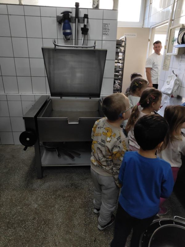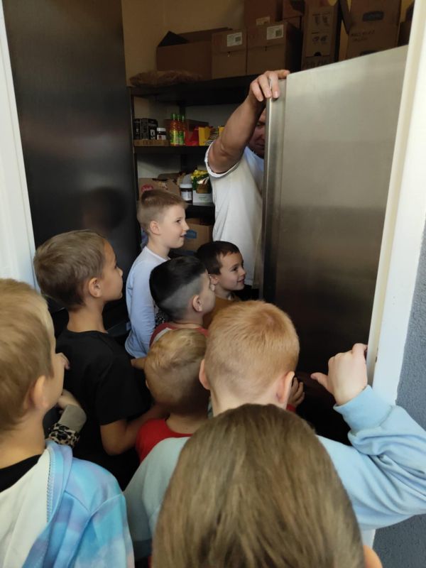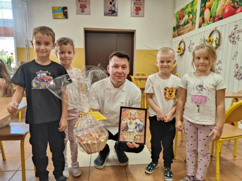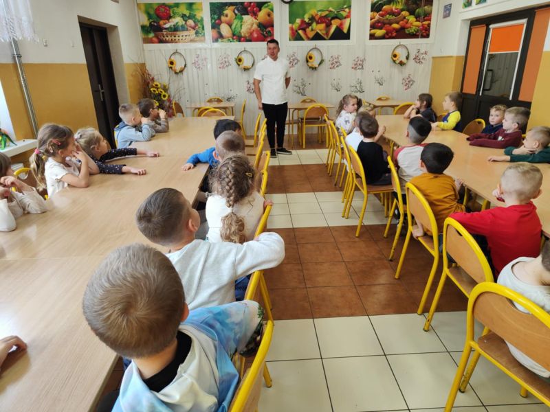 Z okazji Międzynarodowego Dnia Szefa Kuchni, który obchodzony jest 20 października, naszą szkolną stołówkę odwiedziły dzieci z oddziału "0 a" i "0 b". Celem wizyty było poznanie pracy kucharza i całego personelu kuchni, który codziennie przygotowuje smaczne i zdrowe posiłki dla uczniów. Na początku spotkania Pan Marcin Janik serdecznie przywitał przedszkolaków i opowiedział o swojej pracy kucharza. Dzieci z dużym zainteresowaniem słuchały, jak wygląda przygotowywanie śniadań, obiadów i podwieczorków, jakie produkty są używane w kuchni oraz jak ważne jest zachowanie czystości i zasad bezpieczeństwa. Nie zabrakło też pytania od najmłodszych - przedszkolaki chciały wiedzieć, czy kucharz rządzi w kuchni, co lubi jeść i jakie danie lubi najbardziej. Kucharz z uśmiechem odpowiadał na każde pytanie, chętnie dzieląc się ciekawostkami o gotowaniu. Po rozmowie dzieci mogły zwiedzić całą kuchnię – zobaczyć duże garnki, piekarniki, magazyn, zmywarkę i sprzęty używane do przygotowywania posiłków. To była dla nich wyjątkowa okazja, by zobaczyć, jak wygląda praca „od kuchni” w dosłownym tego słowa znaczeniu.
