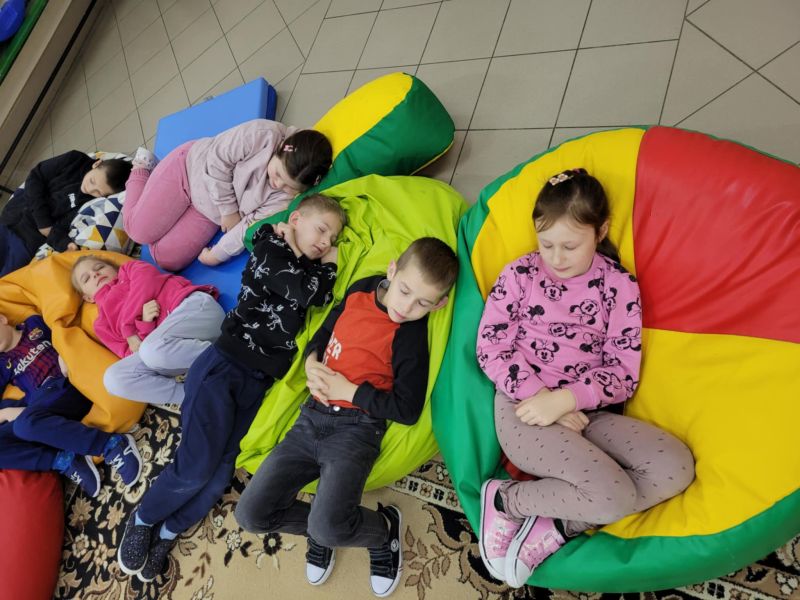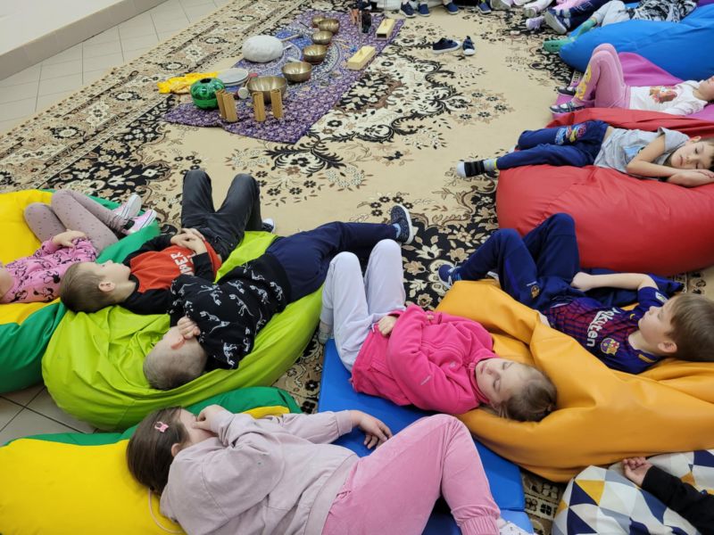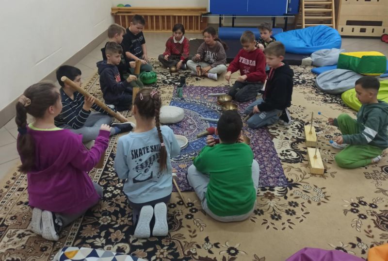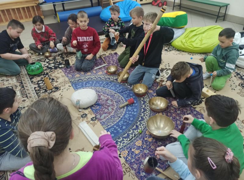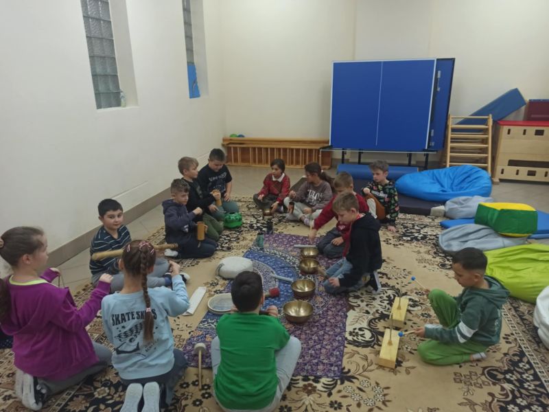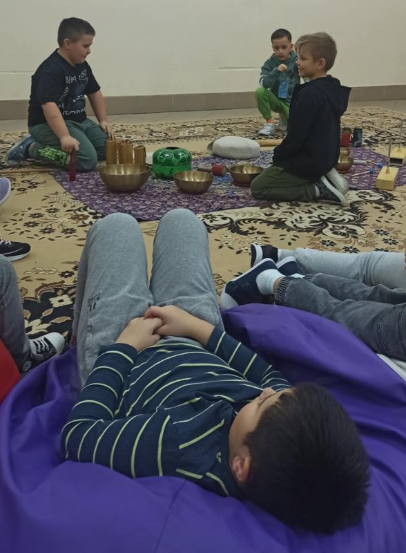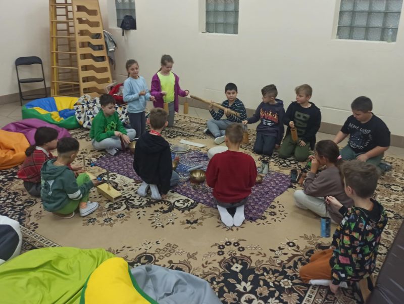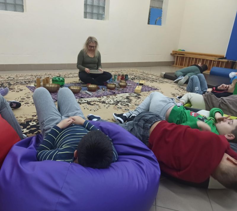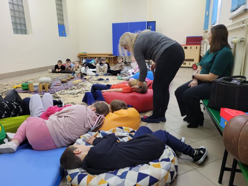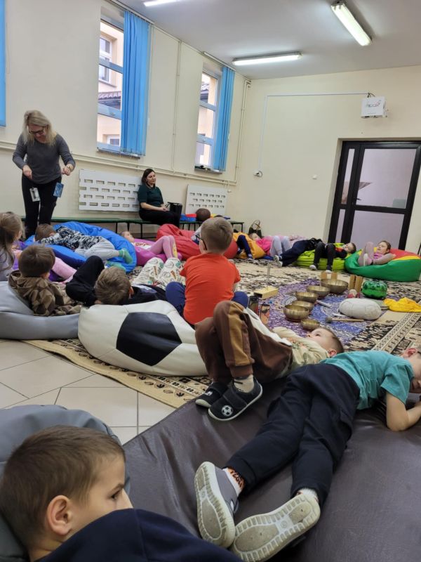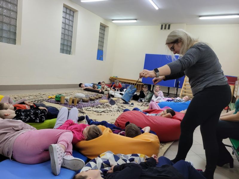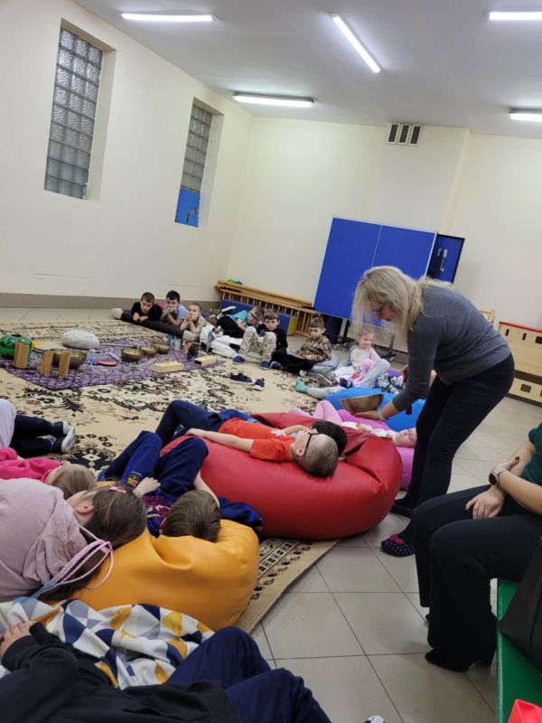 Muzykoterapia ma wiele zalet, takich jak redukcja stresu i napięcia, poprawa nastroju, wsparcie w wyrażaniu i regulacji emocji, a także rozwijanie umiejętności społecznych i poznawczych. Pomaga także rozluźnić mięśnie, łagodzić ból, poprawić jakość snu, a nawet wspierać funkcje fizyczne i intelektualne. Pani Monika prowadziła zajęcia z wykorzystaniem mis tybetańskich, które emitują wibracje wnikające w ciało, odczuwane jako rodzaj masażu dźwiękiem. Uczestnicy warsztatów oddali się więc pełnemu relaksowi i wspaniale współpracowali z Panią Moniką. Na zakończenie każde dziecko mogło samodzielnie zagrać na tybetańskich instrumentach, co sprawiło wszystkim wiele radości.