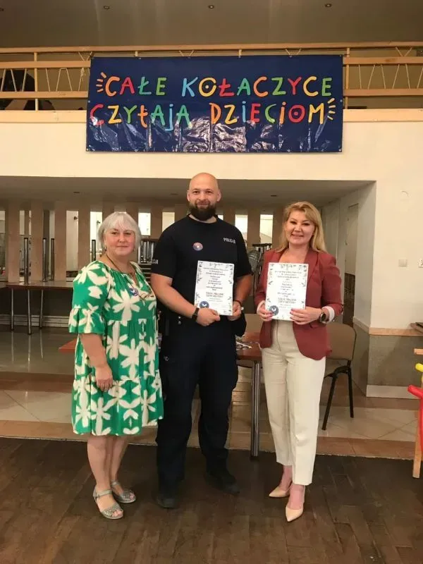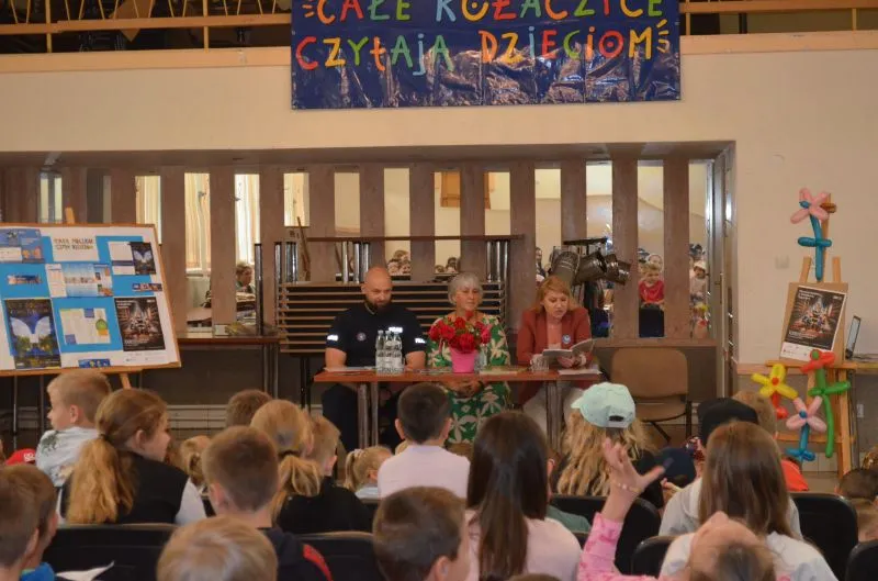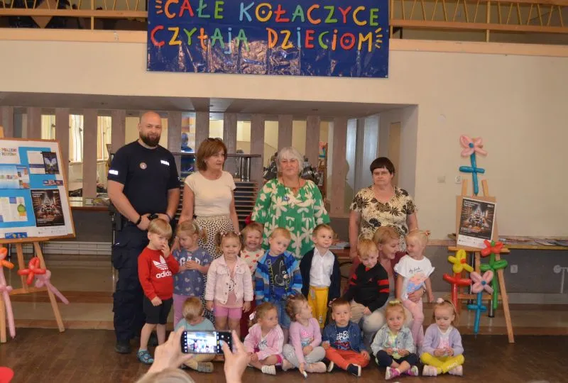 Czytanie rozpoczęliśmy „Lokomotywą ” J. Tuwima w wykonaniu Burmistrz –Magdaleny Stasiowskiej, która doceniając znaczenie głośnego czytania i całej akcji - przyjęła nasze zaproszenie. Natomiast Dzielnicowy Karol Lisowski z Posterunku w Kołaczycach przeczytał opowiadanie,, O ślimaku, który bał się burzy”.