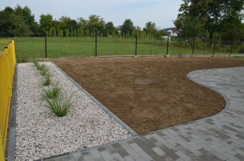 W ramach zagospodarowania terenu zaprojektowano również: ciąg pieszo-jezdny do lokalu żłobka, miejsce postojowe dla osób z niepełnosprawnością, strefę Kids and Ride dla rodziców odwożących dzieci do żłobka oraz plac zabaw o nawierzchni naturalnej żwirowej, ogrodzony z furtką.