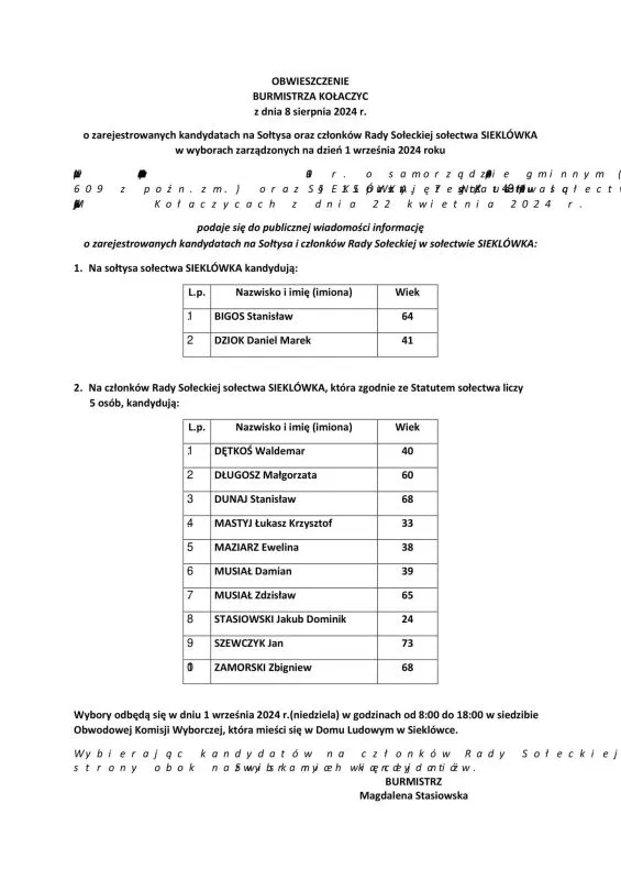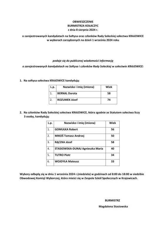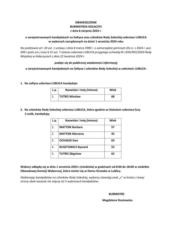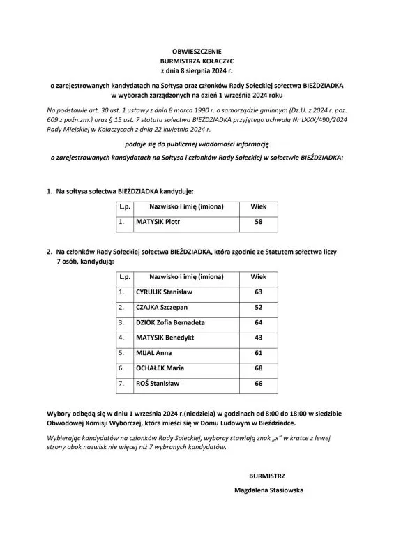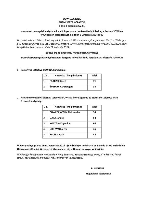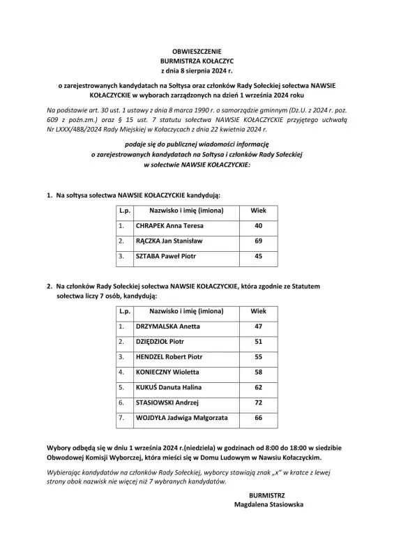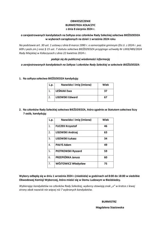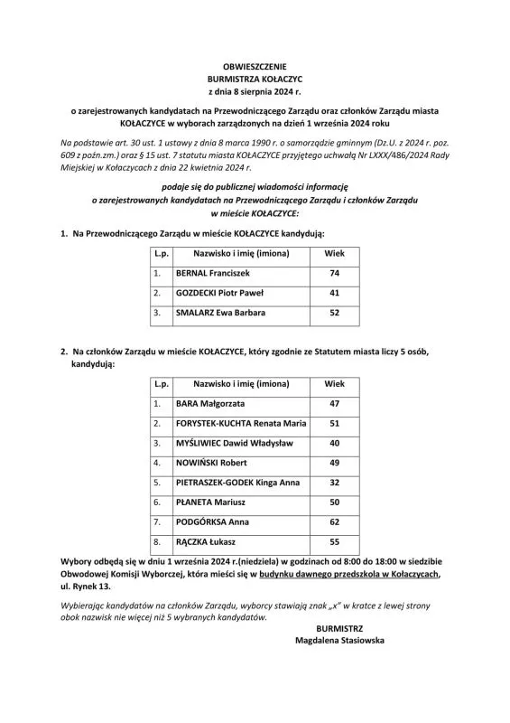 OBWIESZCZENIE BURMISTRZA KOŁACZYC Z DNIA 8 SIERPNIA 2024 R. O ZAREJESTROWANYCH KANDYDATACH NA: