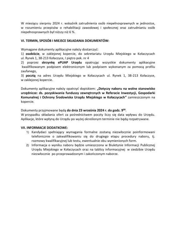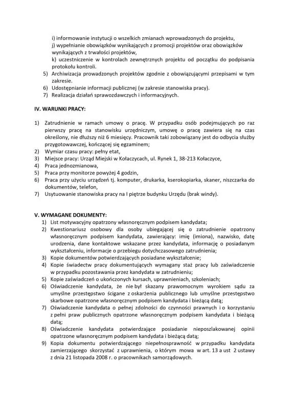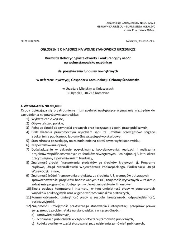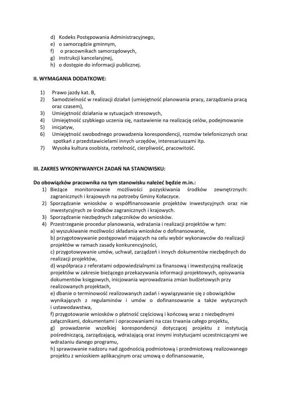 Burmistrz Kołaczyc ogłasza otwarty i konkurencyjny nabór na wolne stanowisko urzędnicze ds. POZYSKIWANIA FUNDUSZY w Referacie Inwestycji, Gospodarki Komunalnej i Ochrony Środowiska.
