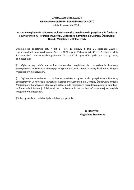 Poniżej Zarządzenie Burmistrz Kołaczyc wraz z ogłoszeniem o naborze: