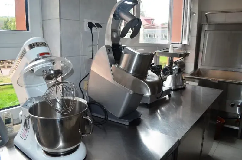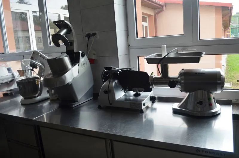Istotnym zakupem okazał się piec konwekcyjno-parowy, trzon gazowy, zmywarka, szatkownica do warzyw, mikser elektryczny/blender, wilk do mięsa, szafki oraz drobniejsze rzeczy, takie jak: pojemniki, miski i koszyczki.