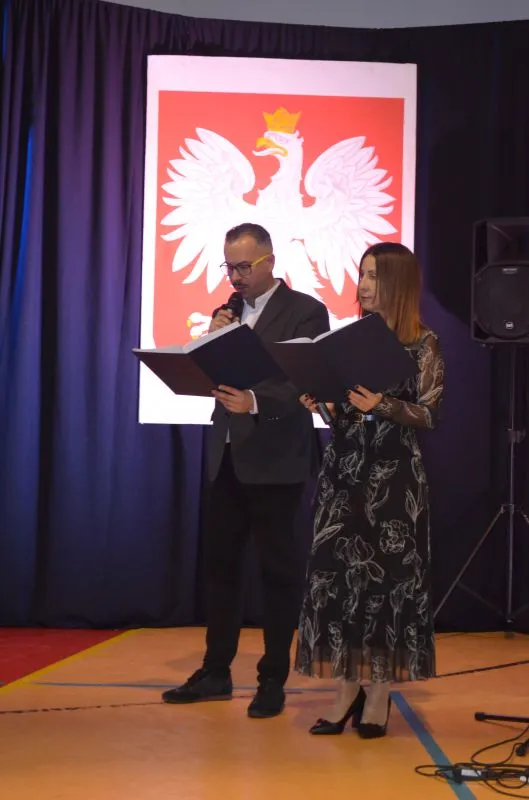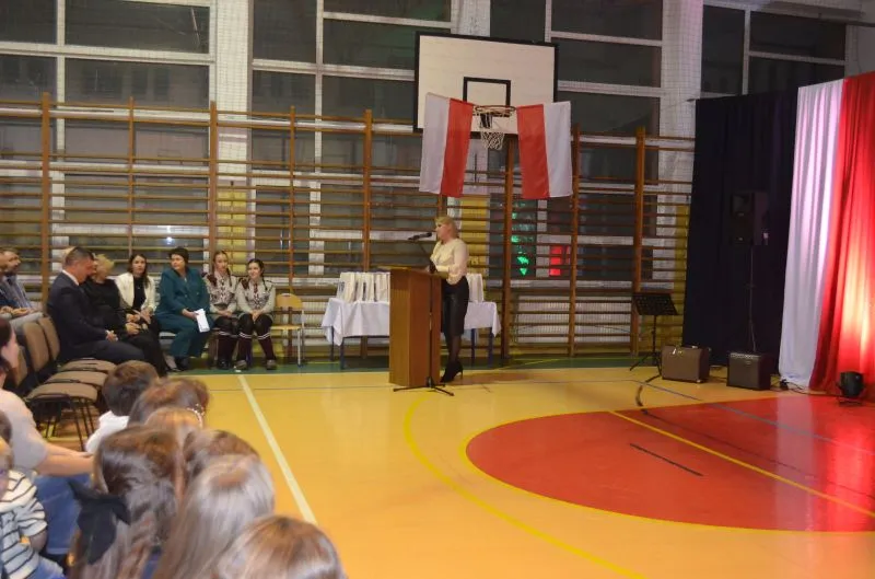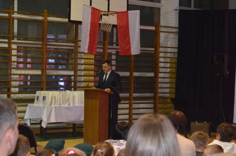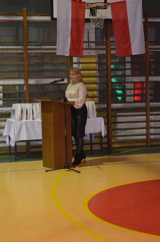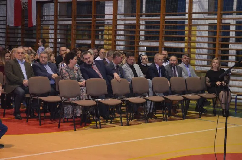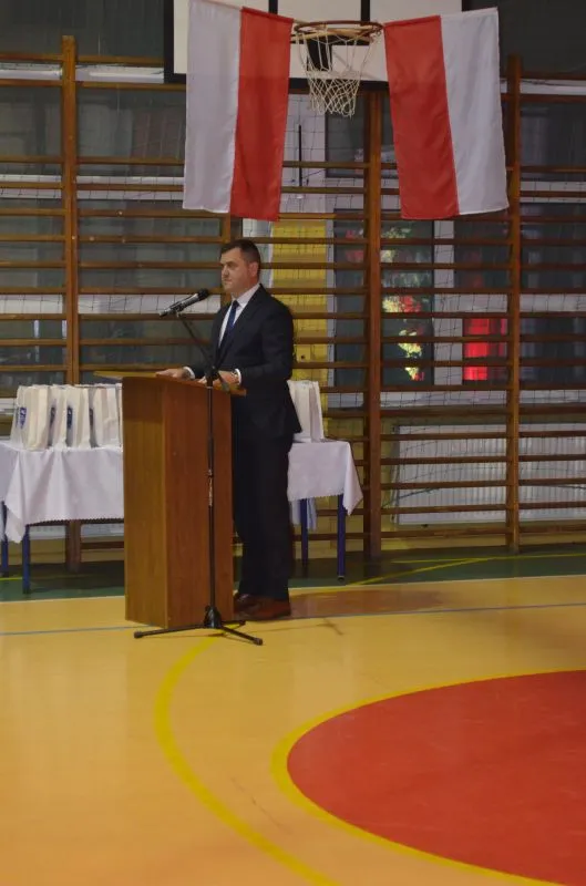 Dyrektor Szkoły Pan Adam Iwanicki uroczyście przywitał wszystkich przybyłych gości, następnie głos zabrała Burmistrz Kołaczyc Pani Magdalena Stasiowska, która wydarzenie to objęła Patronatem Honorowym Burmistrza. Po wypowiedzianych słowach wszyscy ceremonialne odśpiewali Hymn Polski.