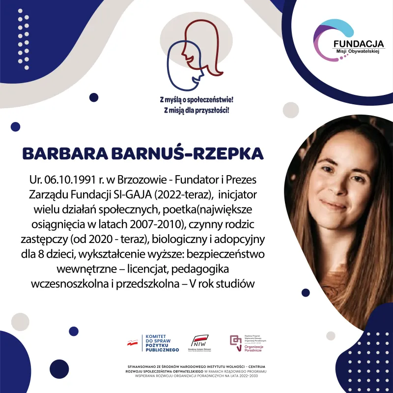 Barbara Barnuś-Rzepka – specjalistka z wieloletnim doświadczeniem w obszarze pieczy zastępczej, prezes fundacji wspierającej rodziny zastępcze, ekspertka w zakresie wsparcia psychologicznego i prawnego dla rodzin opiekujących się dziećmi z trudnymi doświadczeniami życiowymi.