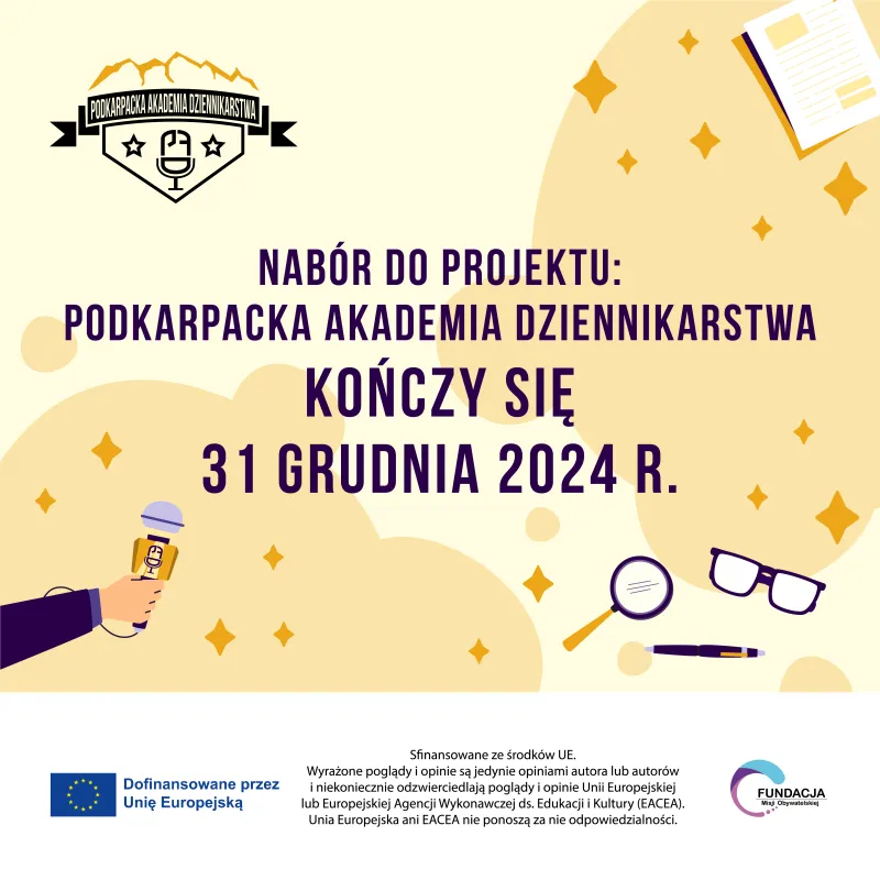 Młodzież z województwa podkarpackiego ma ostatnią szansę, aby dołączyć do projektu „Podkarpacka Akademia Dziennikarstwa” sfinansowanego ze środków Unii Europejskiej! Rekrutacja kończy się 31 grudnia 2024 roku, a liczba miejsc jest ograniczona.