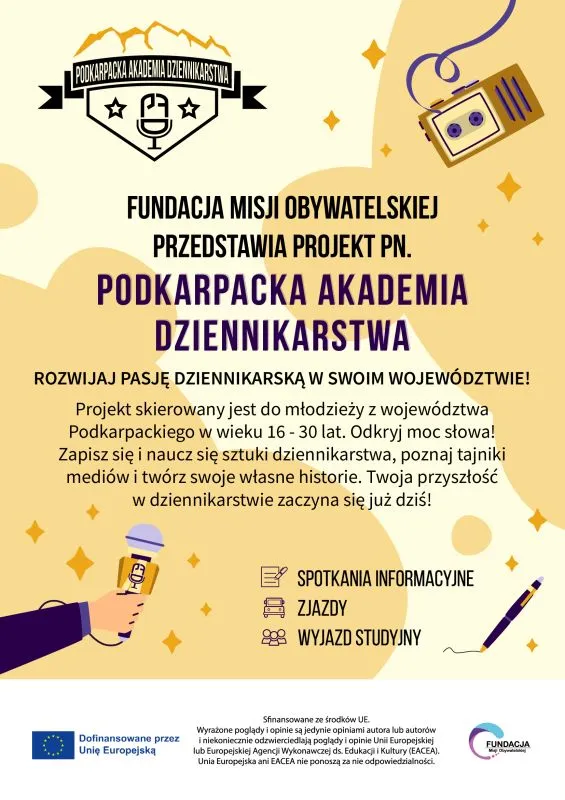 „Podkarpacka Akademia Dziennikarstwa” to wyjątkowa okazja do zdobycia nowych umiejętności i doświadczeń. Młodzież w wieku 16-30 lat będzie mogła rozwinąć swoje kompetencje medialne i obywatelskie poprzez udział w warsztatach i sesjach mentoringowych oraz współpracę z ekspertami w dziedzinie mediów.