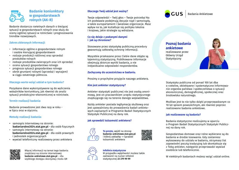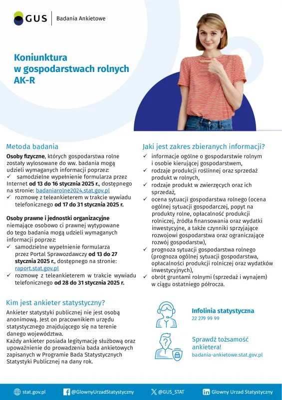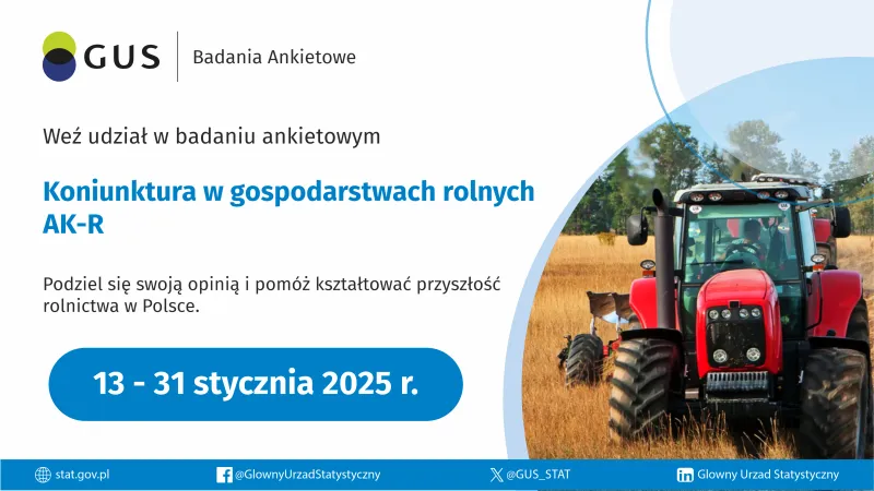 Urząd Statystyczny w Zielonej Górze informuje, że w dniach od 13 do 31 stycznia br. na terenie całej Polski po raz kolejny zostanie przeprowadzone Badanie Koniunktury w Gospodarstwach Rolnych (AK-R).