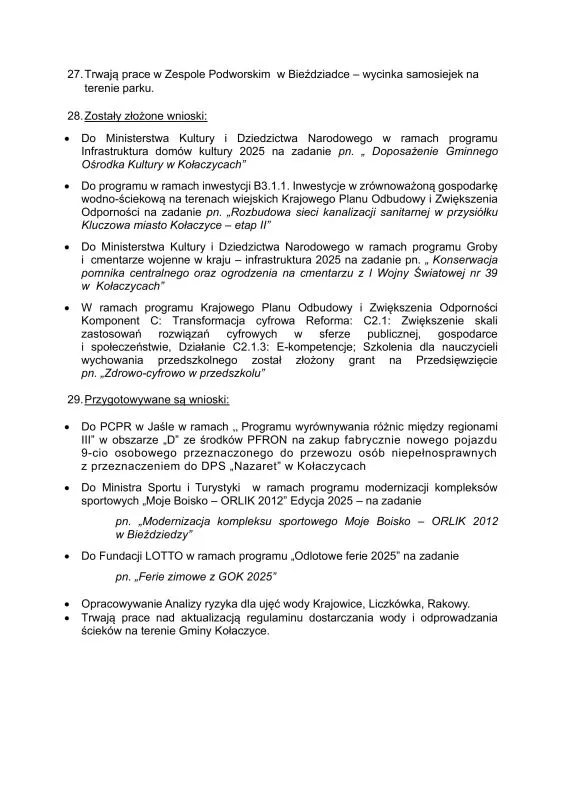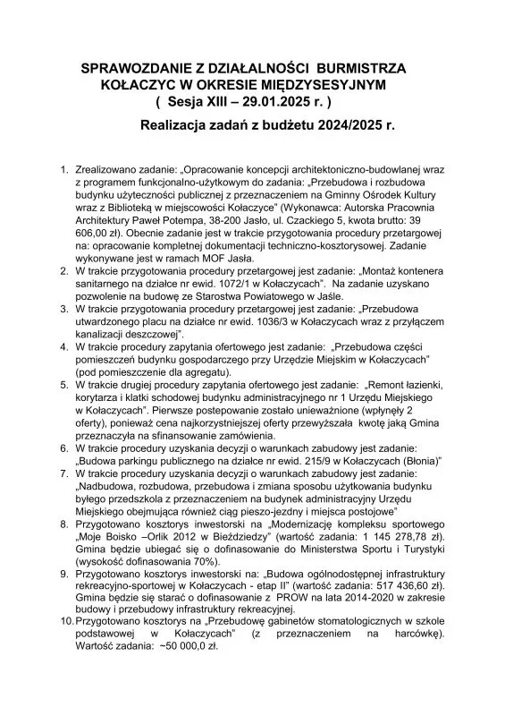 W załączeniu Sprawozdanie z działalności Burmistrza Kołaczyc w okresie międzysesyjnym.
