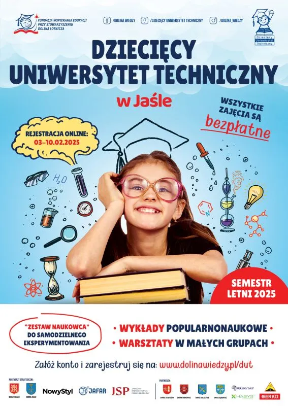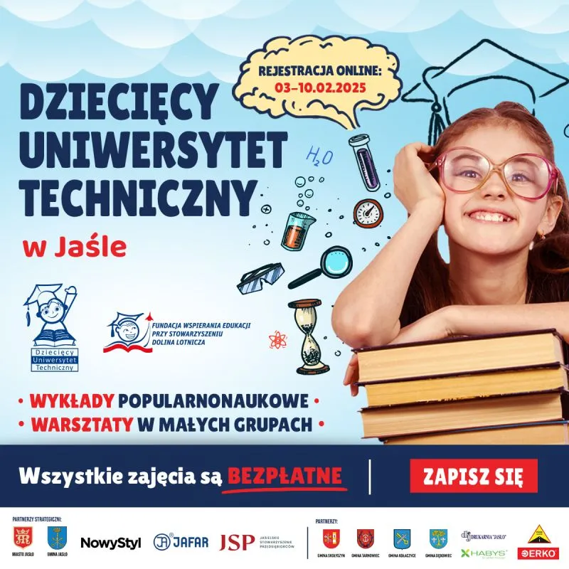 Już 3 lutego 2025 r. rozpoczyna się rekrutacja na Dziecięcy Uniwersytet Techniczny w Jaśle na semestr letni 2025! To wyjątkowa okazja dla dzieci w wieku 7-12 lat, zamieszkałych na terenie powiatu jasielskiego, aby odkrywać fascynujący świat nauki w formie interaktywnych wykładów i warsztatów.