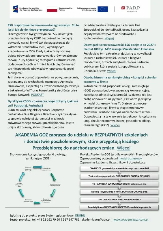 AKADEMIA GOZ ZAPRASZA WSZYSTKICH PRZEDSIĘBIORCÓW DO UDZIAŁU W BEZPŁATNYCH SZKOLENIACH ORAZ DORADZTWIE POSZKOLENIOWYM