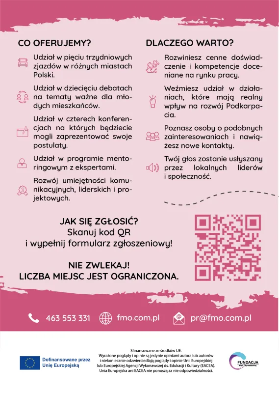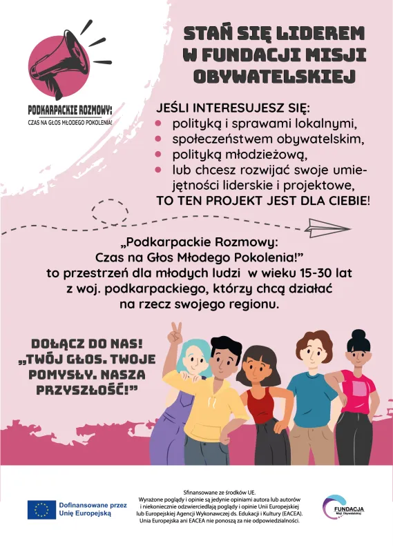 Fundacja Misji Obywatelskiej przekazuje informacje odnośnie projektu „Podkarpackie Rozmowy: Czas na Głos Młodego Pokolenia!”, finansowanego ze środków Unii Europejskiej.