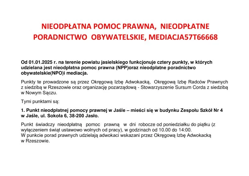Zgodnie z art. 8a ust. 1 pkt 1 i pkt 2 ustawy z dnia 5 sierpnia 2015 roku o nieodpłatnej pomocy prawnej, nieodpłatnym poradnictwie obywatelskim oraz edukacji prawnej (Dz.U. 2024. poz. 1534 t.j.), Starostwo Powiatowe w Jaśle w załączeniu przedstawia zaktualizowaną listę punktów nieodpłatnej pomocy prawnej, nieodpłatnego poradnictwa obywatelskiego i mediacji.