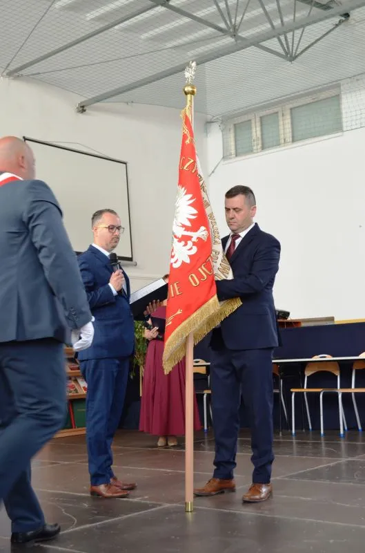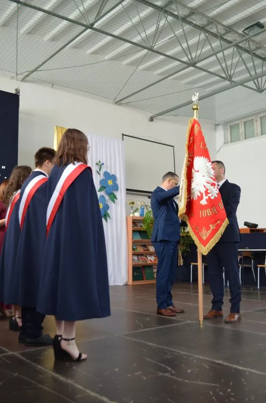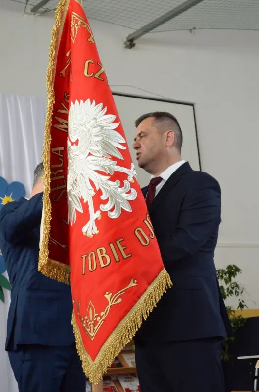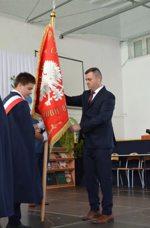 Dyrektor Pan Adam Iwanicki serdecznie powitał wszystkich gości i przypomniał o bogatej historii Szkoły. Wzruszającym momentem było uroczyste przekazanie sztandaru Szkoły Dyrektorowi przez Radę Rodziców, a następnie przekazanie go delegatom pocztu sztandarowego. Uroczystość uświetniło również piękne odśpiewanie hymnu szkoły przez chór "Fraza".