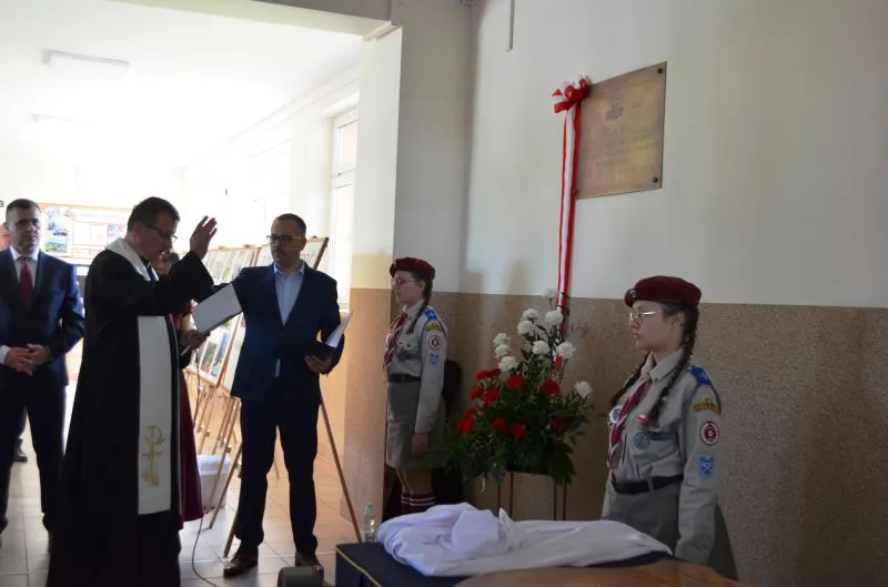 Następnie wszyscy udali się do budynku, by świadkować ważnemu momentowi – poświęceniu i uroczystemu odsłonięciu pamiątkowej tablicy. Aktu tego dokonała Burmistrz Kołaczyc, Pani Magdalena Stasiowska, wraz z Dyrektorem PSP w Kołaczycach, Panem Adamem Iwanickim. Centralnym punktem uroczystości była część artystyczna, która rozpoczęła się na sali gimnastycznej.