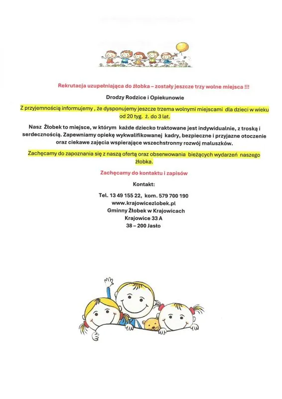 REKRUTACJA UZUPEŁNIAJĄCA W GMINNYM ŻŁOBKU W KRAJOWICACH