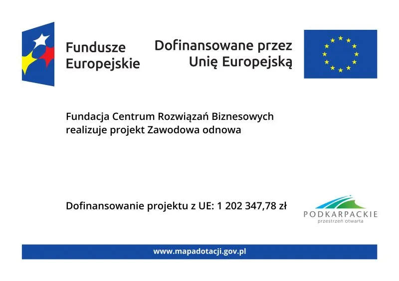 Fundacja Centrum Rozwiązań Biznesowych (Lider projektu) wraz z SOLVA sp. z o. o. realizują projekt „Zawodowa odnowa” który jest wspófinansowany ze środków Europejskiego Funduszu Społecznego Plus w ramach Programu Fundusze Europejskie dla Podkarpacia 2021-2027.