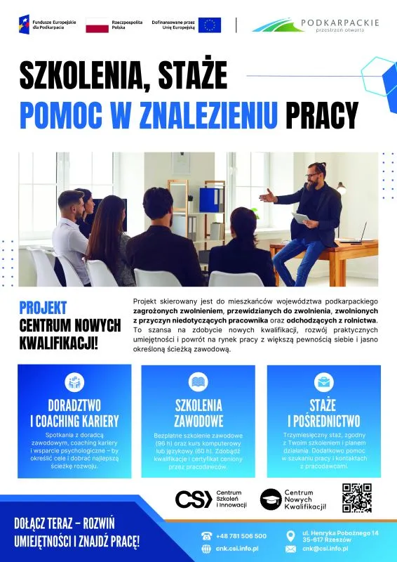 W imieniu Centrum Szkoleń i Innowacji Sp. z o.o. pragniemy zaprosić Państwa do współpracy przy realizacji projektu pn. „Centrum nowych kwalifikacji!” (nr FEPK.07.08-IP.01-0020/24), realizowanego w ramach programu Fundusze Europejskie dla Podkarpacia 2021–2027, współfinansowanego z Europejskiego Funduszu Społecznego Plus.
