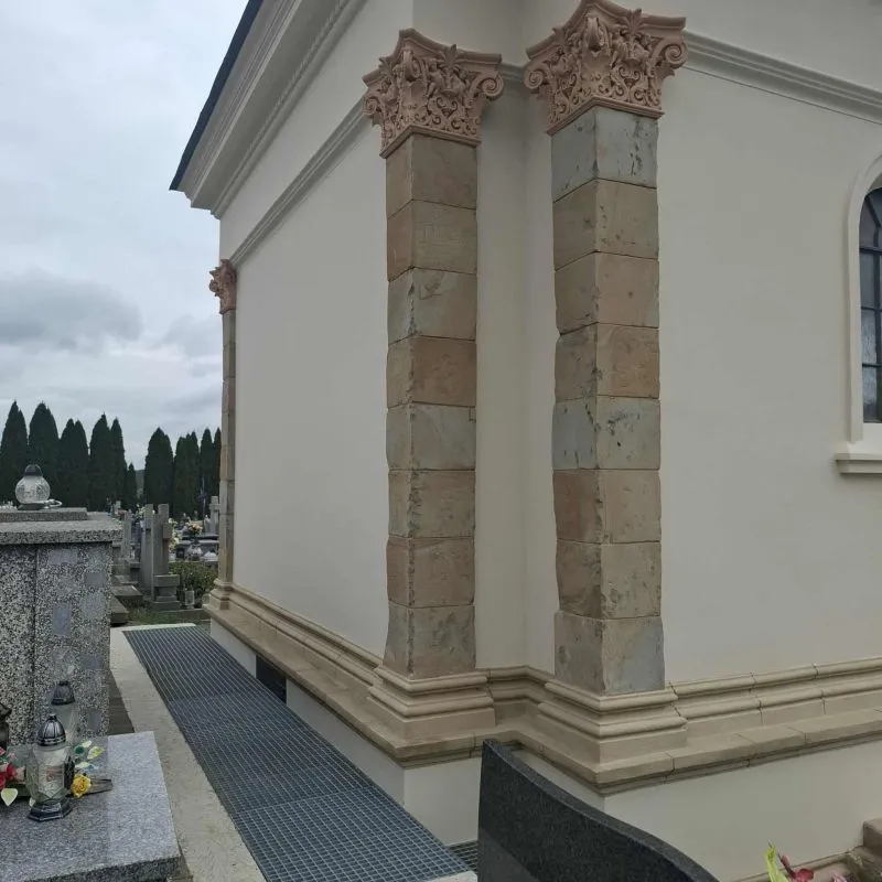 - Rekonstrukcję brakujących elementów architektonicznych, takich jak gzymsy oraz uzupełnianie ubytków kamienia.
