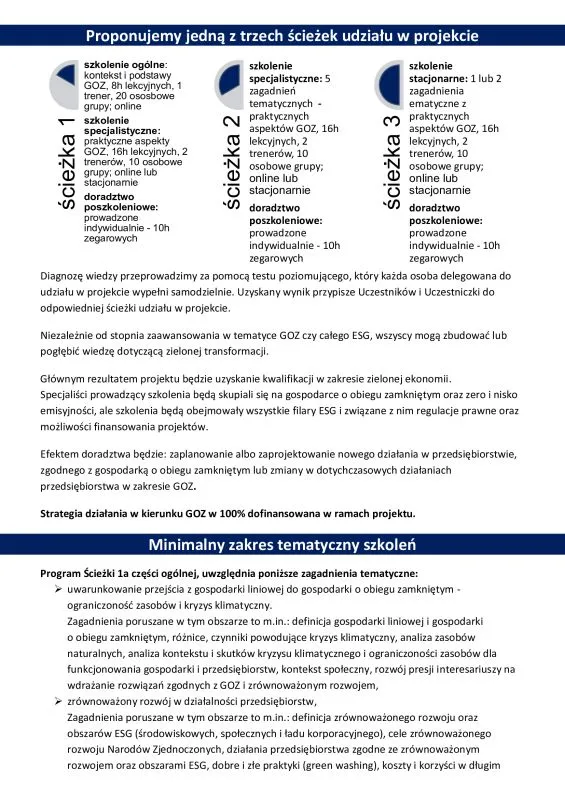 Projekt jest skierowany do przedsiębiorstw. Każde z nich może skorzystać z 16 godzin szkolenia specjalistycznego, 8 godzin szkolenia ogólnego i 10 godzin indywidualnego doradztwa poszkoleniowego z tematyki Gospodarki o Obiegu Zamkniętym. GOZ to jeden z trzech filarów ESG i ma ogromny wpływ na lepsze wyniki w raportowaniu pozafinansowym.