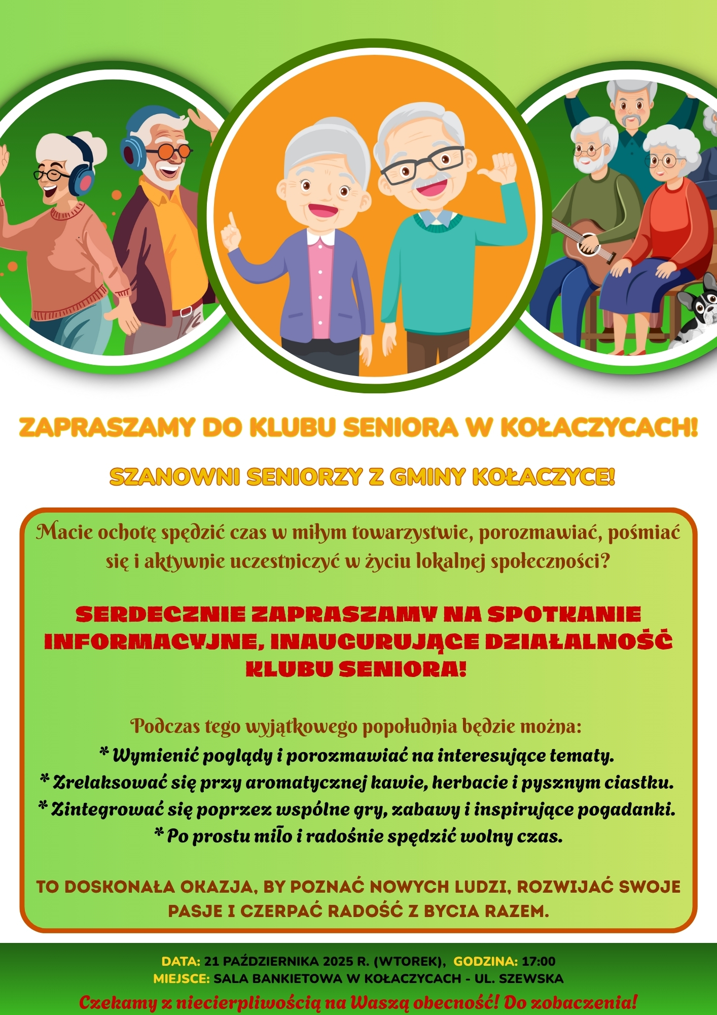 Serdecznie zapraszamy na SPOTKANIE INAUGURUJĄCE działalność Klubu Seniora w Kołaczycach!