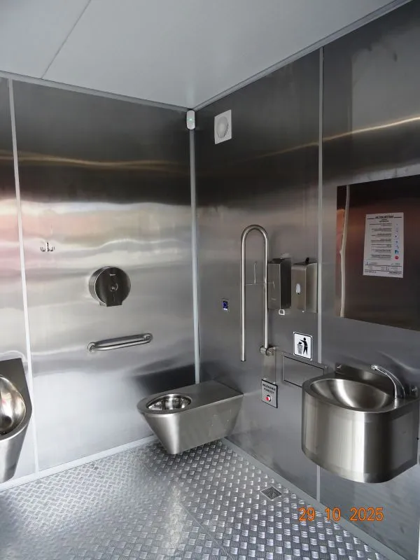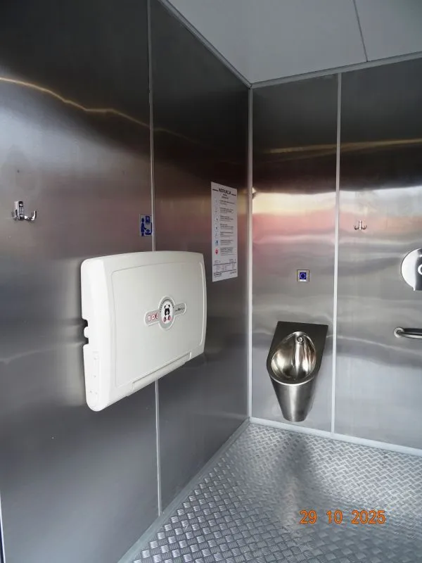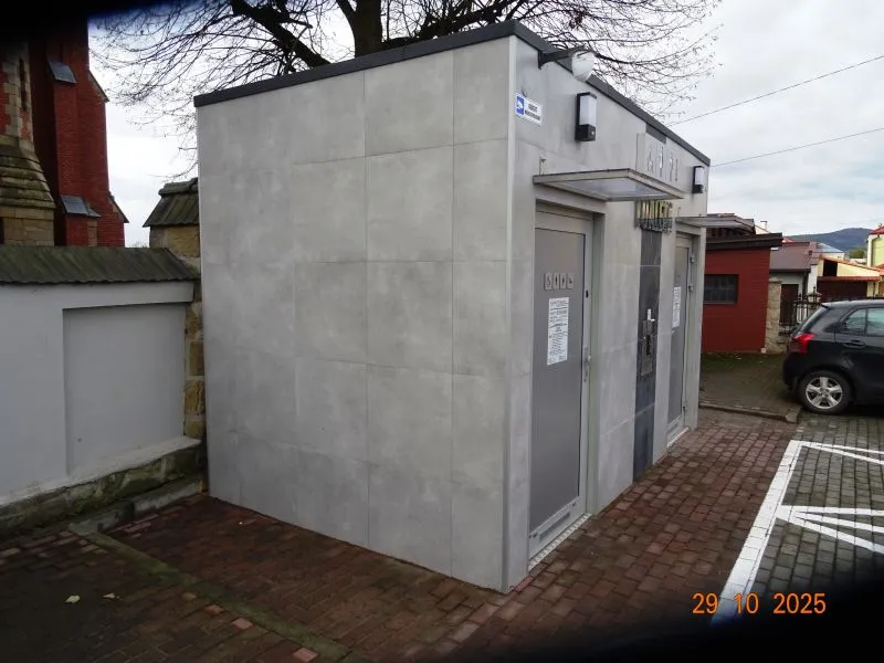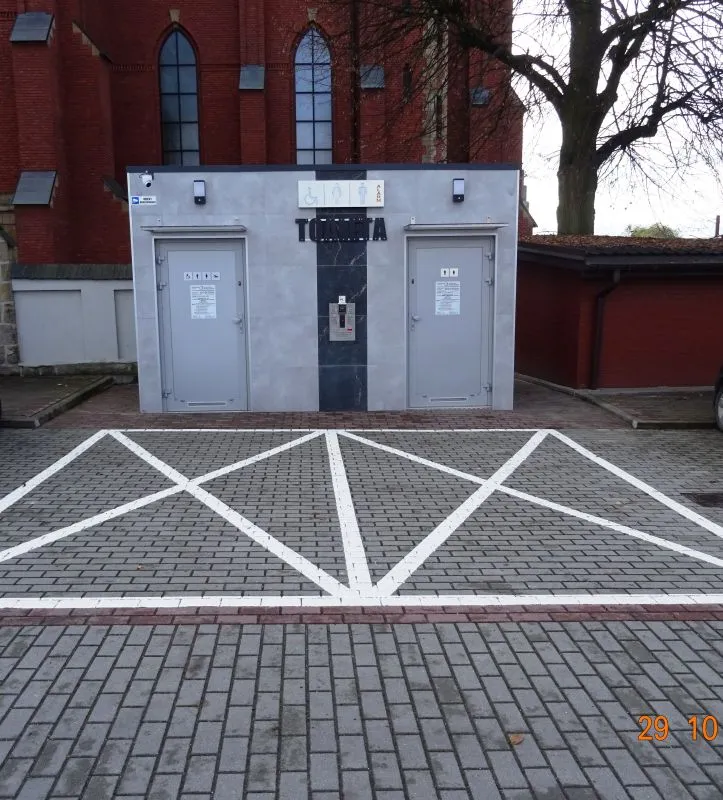 Zadanie objęło montaż prefabrykowanego kontenera sanitarnego (automatycznej toalety publicznej), która została zlokalizowana na chodniku przy parkingu publicznym na działce nr ewid. 1072/1. Kontener ten to gotowa do montażu kabina, w pełni wyposażona we wszystkie instalacje i zabezpieczenia. Toaleta jest podzielona na WC dla mężczyzn/osób niepełnosprawnych, WC dla kobiet oraz pomieszczenie serwisowe (techniczne), w którym znajduje się automatyka i oprzyrządowanie sterownicze.