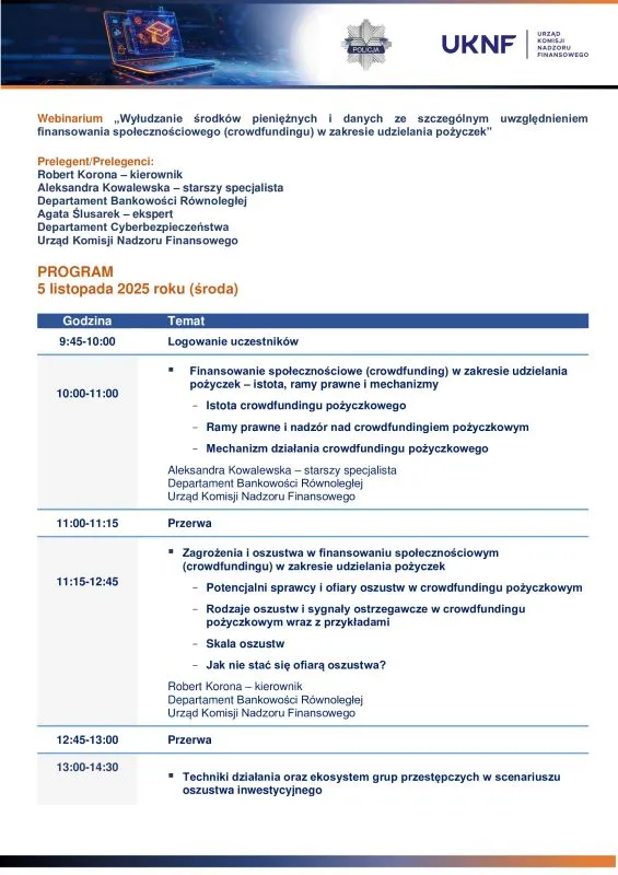 Urząd Komisji Nadzoru Finansowego zaprasza osoby fizyczne i prawne zainteresowane rynkiem crowdfundingowym jako inwestorzy, właścicieli projektów crowdfundingowych oraz dostawców usług finansowania społecznościowego na webinarium „Wyłudzanie środków pieniężnych i danych ze szczególnym uwzględnieniem finansowania społecznościowego (crowdfundingu) w zakresie udzielania pożyczek” organizowane w ramach projektu Centrum Edukacji dla Uczestników Rynku – CEDUR, we współpracy z Komendą Główną Policji.