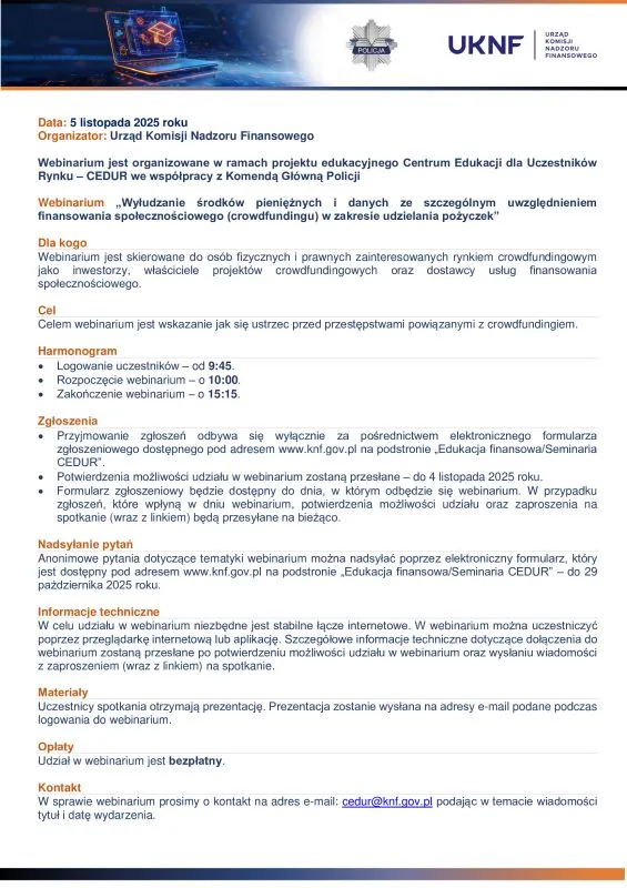 Urząd KNF - zaproszenie na webinarium CEDUR "Wyłudzanie środków pieniężnych i danych ze szczególnym uwzględnieniem finansowania społecznościowego (crowdfundingu) w zakresie udzielania pożyczek"