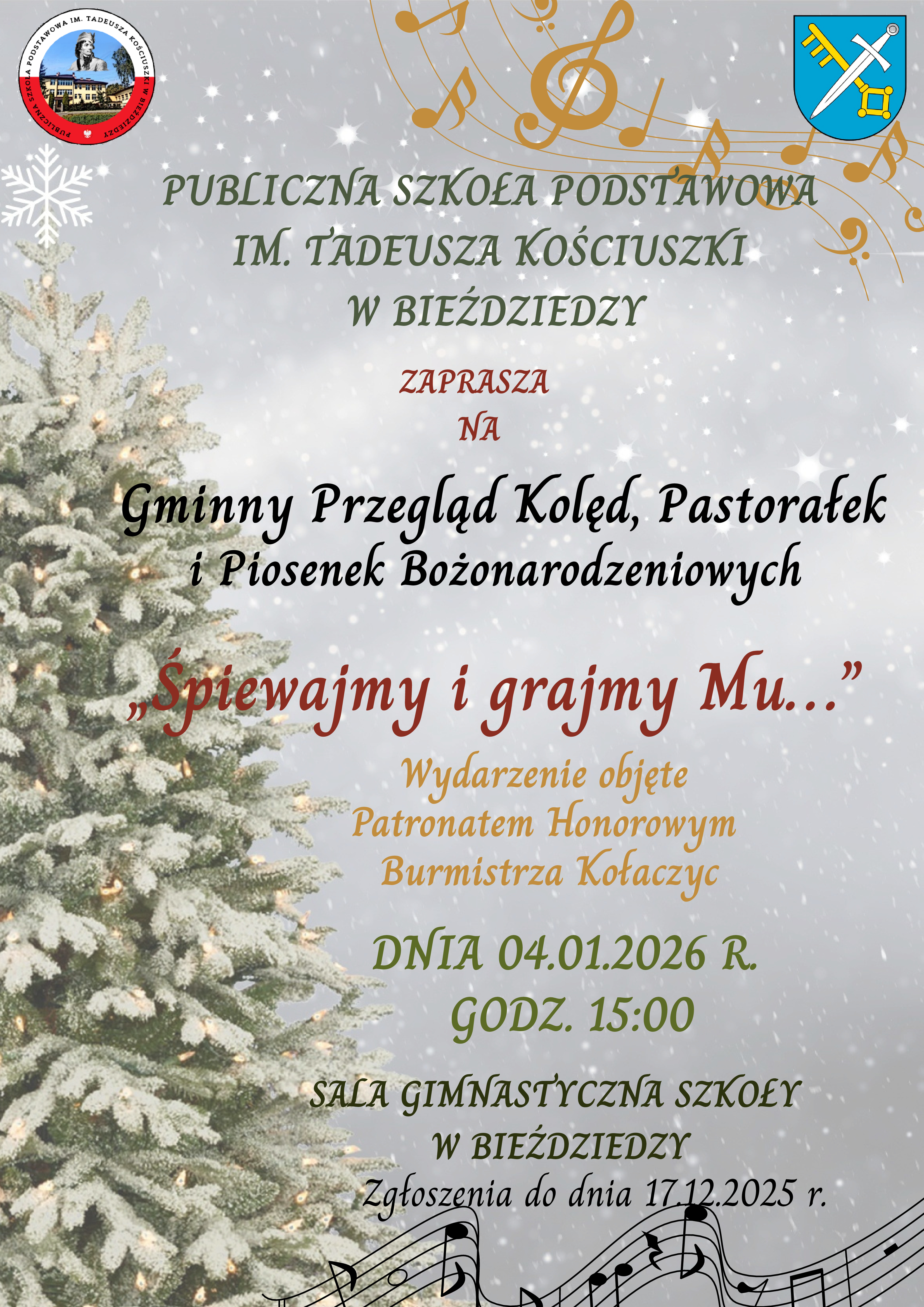 Publiczna Szkoła Podstawowa im. Tadeusza Kościuszki w Bieździedzy zaprasza na piękne, świąteczne wydarzenie pod hasłem: „Śpiewajmy i grajmy Mu…”
