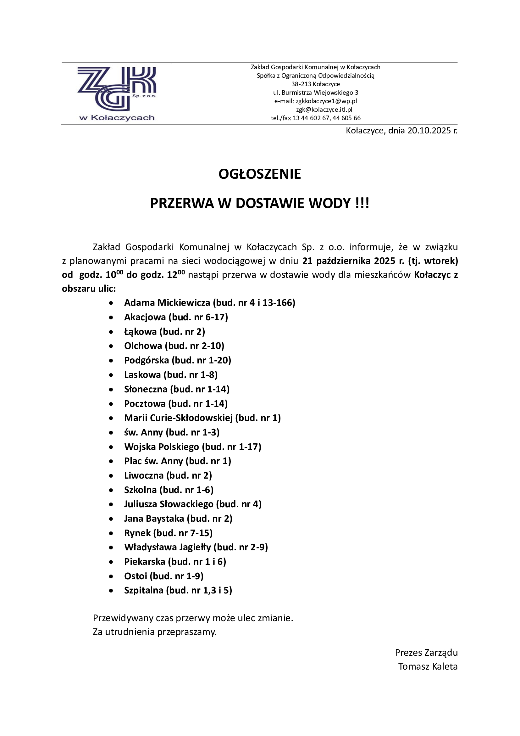 OGŁOSZENIE DOTYCZĄCE PRZERWY W DOSTAWIE WODY