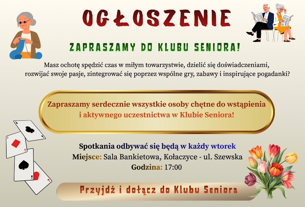 Spotkania Klubu Seniora odbywać się będą cyklicznie w każdy wtorek, o godzinie 17:00, na sali bankietowej w Kołaczycach.