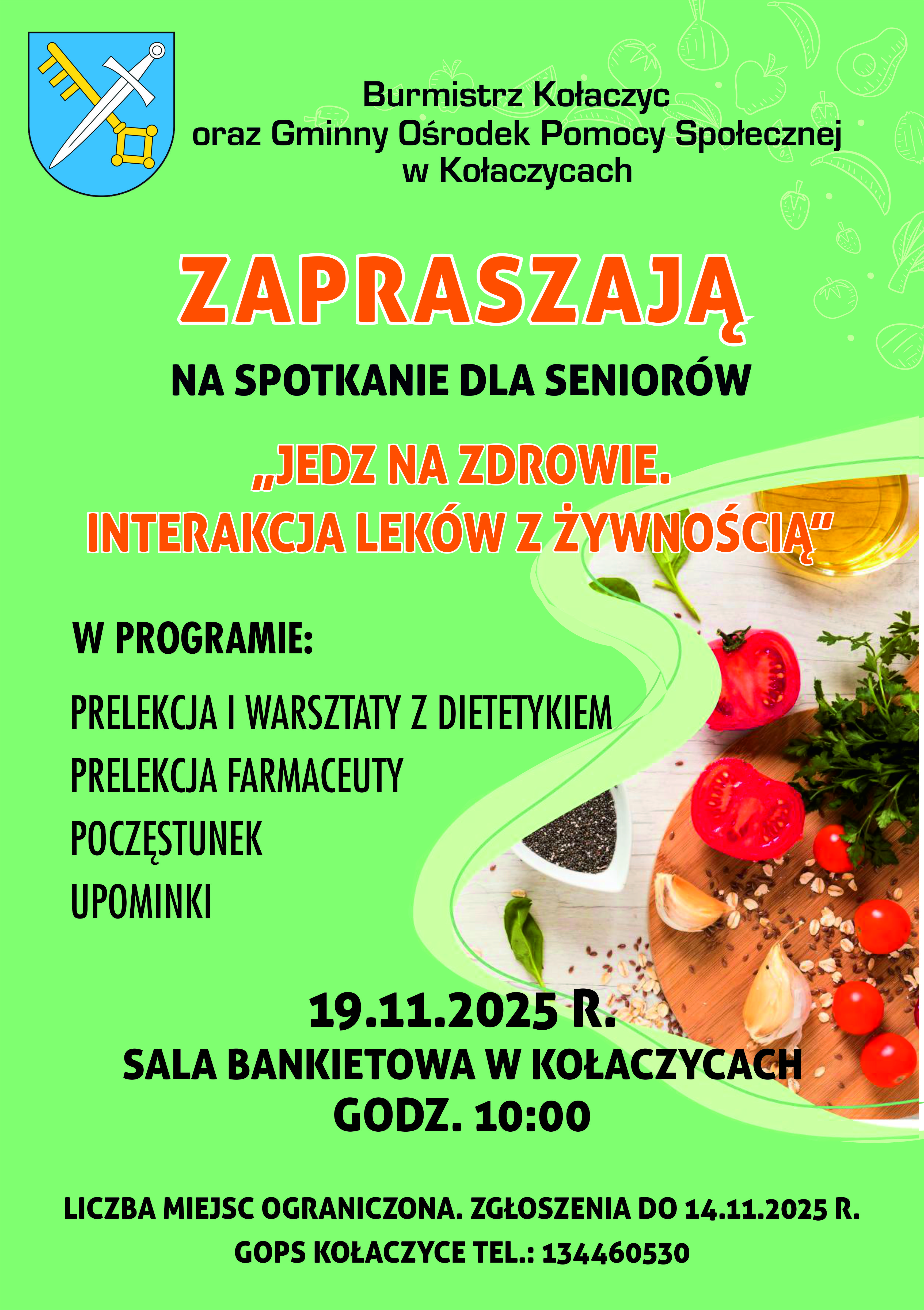 Burmistrz Kołaczyc oraz Gminny Ośrodek Pomocy Społecznej w Kołaczycach zapraszają na wydarzenie: "JEDZ NA ZDROWIE. INTERAKCJA LEKÓW Z ŻYWNOŚCIĄ".