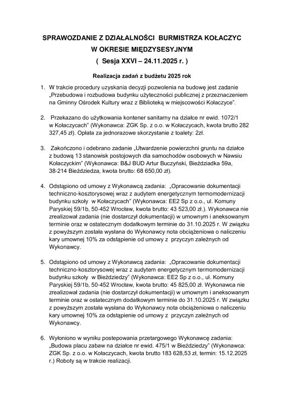 W załączeniu Sprawozdanie z działalności Burmistrza Kołaczyc w okresie międzysesyjnym.
