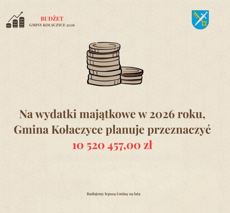 - Stawiamy na rozwój! Na wydatki majątkowe w 2026 roku Gmina Kołaczyce planuje przeznaczyć ponad 10 milionów złotych. Między innymi planowane są drogi, chodniki, rozbudowa sieci kanalizacji i wodociągów, modernizacja domu kultury, budowa Centrum Zarządzania Kryzysowego z miejscami doraźnego schronienia, rozbudowę cmentarzy, itd....