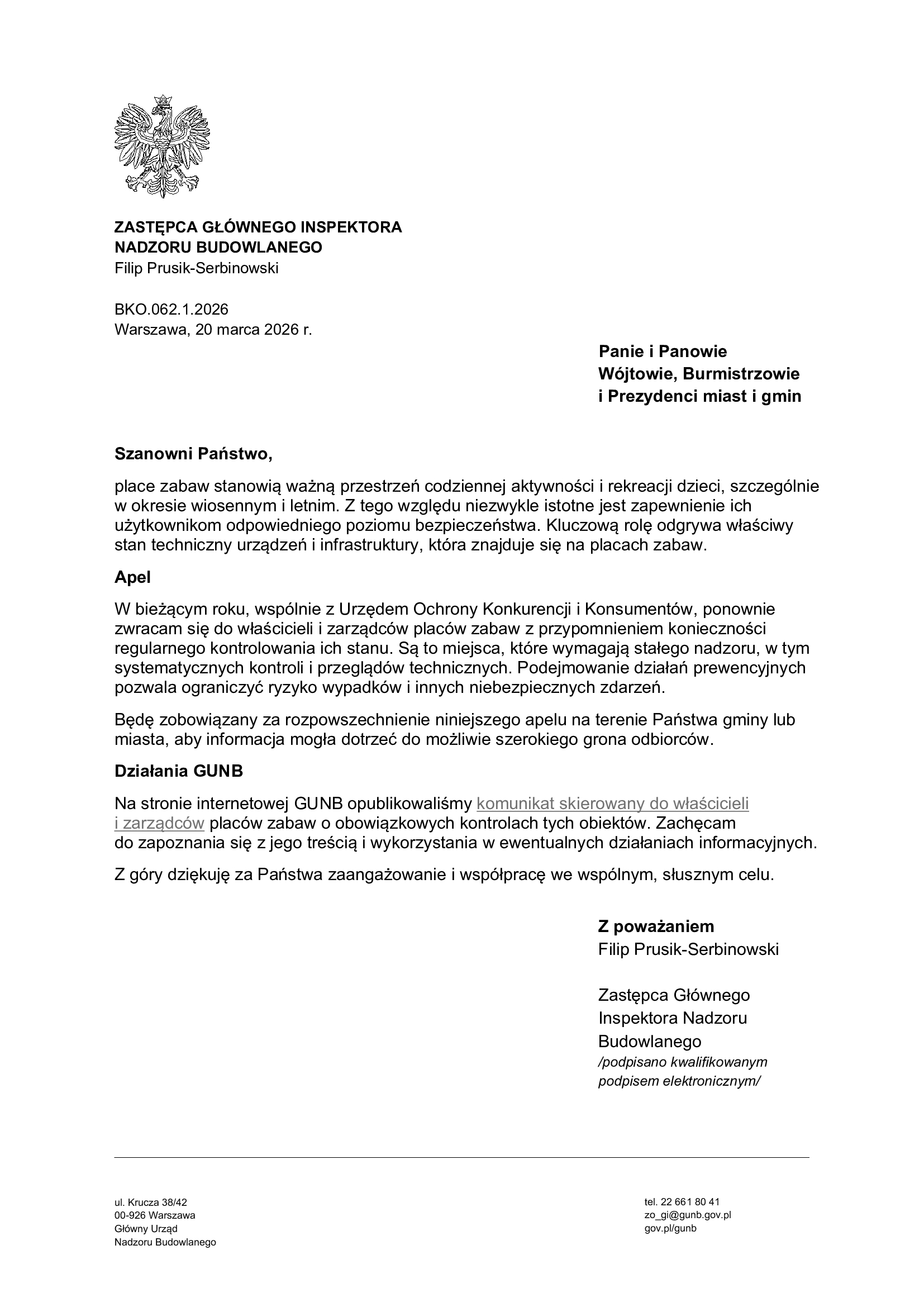 Link do komunikatu skierowanego do właścicieli i zarządców znajduje się na stronie GUNB: https://www.gov.pl/web/gunb/bezpieczne-place-zabaw--komunikat-glownego-inspektora-nadzoru-budowlanego-i-urzedu-ochrony-konkurencji-i-konsumentow