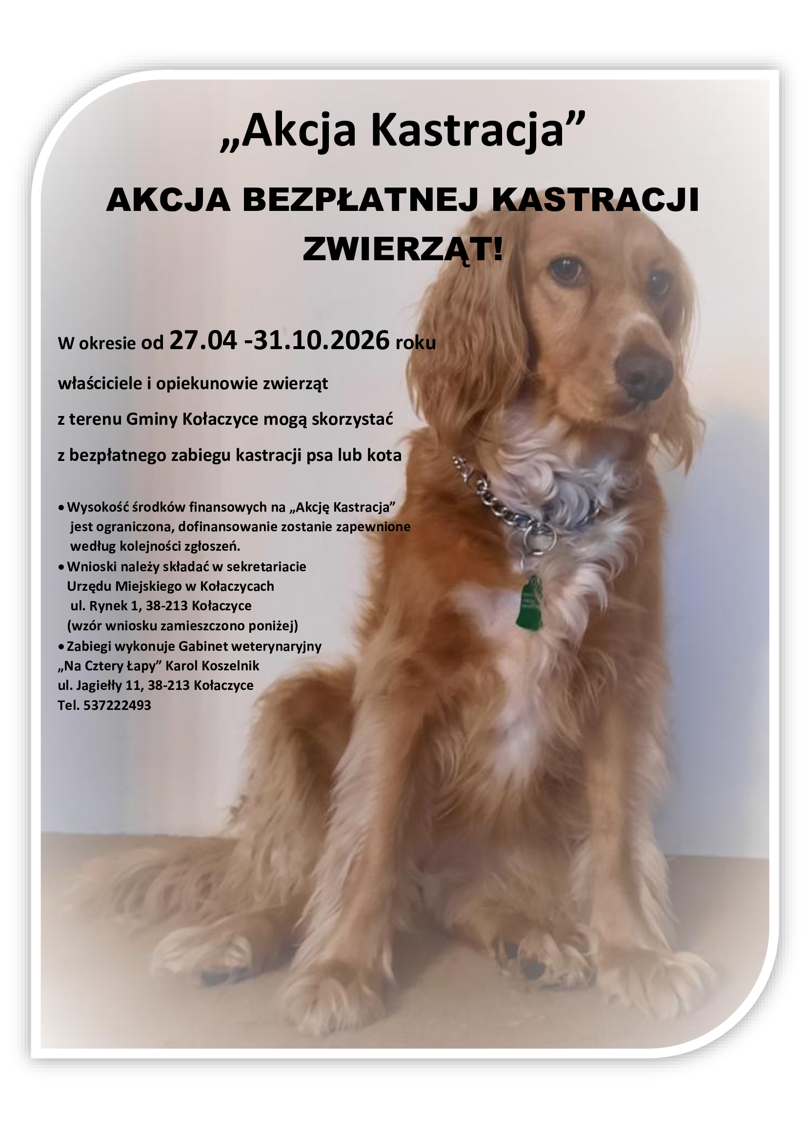 Zabiegi wykonywane będą w Gabinecie Weterynaryjnym „Na Cztery Łapy” Karol Koszelnik (ul. Jagiełły 11, Kołaczyce).