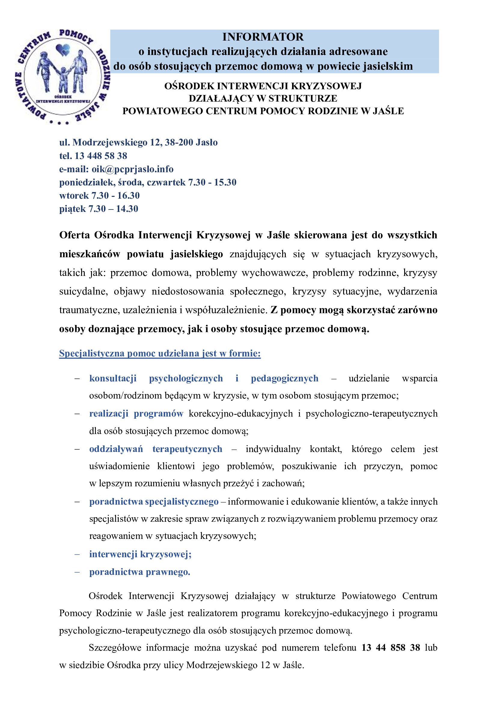 Przedstawiamy dane teleadresowe 𝐎ś𝐫𝐨𝐝𝐤𝐚 𝐈𝐧𝐭𝐞𝐫𝐰𝐞𝐧𝐜𝐣𝐢 𝐊𝐫𝐲𝐳𝐲𝐬𝐨𝐰𝐞𝐣 𝐝𝐳𝐢𝐚ł𝐚𝐣ą𝐜𝐞𝐠𝐨 𝐰 𝐬𝐭𝐫𝐮𝐤𝐭𝐮𝐫𝐳𝐞 𝐏𝐨𝐰𝐢𝐚𝐭𝐨𝐰𝐞𝐠𝐨 𝐂𝐞𝐧𝐭𝐫𝐮𝐦 𝐏𝐨𝐦𝐨𝐜𝐲 𝐑𝐨𝐝𝐳𝐢𝐧𝐢𝐞 𝐰 𝐉𝐚ś𝐥𝐞 wraz z ofertą pomocy skierowaną do osób stosujących przemoc domową.